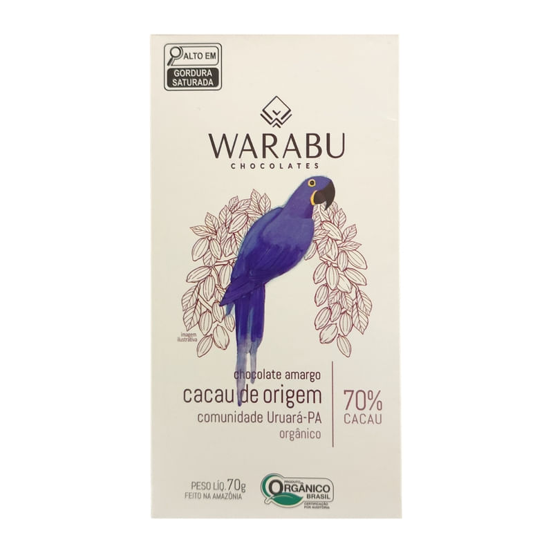 <p>O <strong>chocolate amargo Wabaru 70% cacau</strong> é desenvolvido com cacau da comunidade Uruará e outros ingredientes naturais selecionados, orgânicos, livres de glúten e de lactose. Cada mordida proporciona uma explosão de sabores intensos e toque de frutas amarelas.</p> <h2><strong>Sugestão de consumo:</strong></h2> <p>Super versátil, o chocolate Wabaru pode ser consumido como sobremesa ou fazendo parte de receitas culinárias.</p> <h2><strong>Motivos para escolher o produto:</strong></h2> <ul> <li> <p>Embalagem com 70g;</p> </li> <li> <p>Ingredientes orgânicos;</p> </li> <li> <p>Clean-label;</p> </li> <li> <p>Vegano;</p> </li> <li> <p>Sem OGM (organismos geneticamente modificados);</p> </li> <li> <p>Sem conservantes, adoçantes e aromas artificiais;</p> </li> <li> <p>Livre de glúten, soja e leite;</p> </li> <li> <p>Feito com o método Bean to bar: utiliza poucos ingredientes, resultando em um chocolate mais puro, pouco processado, muito mais saboroso e nutritivo.</p> </li> </ul> <h2><strong>A Marca</strong></h2> <p>A Wabaru foi fundada pelo chef e empresário Jorge Neves no ano de 2018, a marca nasceu com o propósito de resgatar a cultura do cultivo do cacau na Amazônia. Cada chocolate é desenvolvido com cacau selvagem orgânico, de espécie nativa, situada na bacia Amazônica, garantindo um chocolate rico em sabor, responsabilidade e compromisso com a natureza e as pessoas que nela vivem.</p> <p> </p>