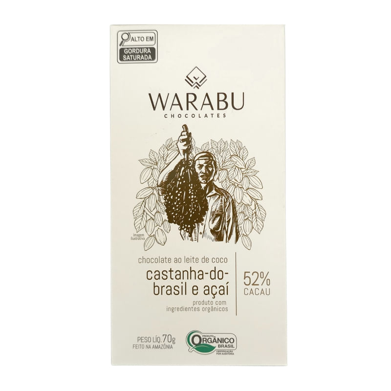 <p>O <strong>chocolate Wabaru 52% cacau ao leite de coco, com castanha do Brasil e açaí</strong> é desenvolvido com ingredientes naturais selecionados, orgânicos, livres de glúten e de lactose. Cada mordida proporciona uma explosão de sabores, com notas suaves e textura cremosa.</p> <h2><strong>Sugestão de consumo:</strong></h2> <p>Super versátil, o chocolate Wabaru pode ser consumido como sobremesa ou fazendo parte de receitas culinárias.</p> <h2><strong>Motivos para escolher o produto:</strong></h2> <ul> <li> <p>Embalagem com 70g;</p> </li> <li> <p>Ingredientes orgânicos;</p> </li> <li> <p>Clean-label;</p> </li> <li> <p>Vegano;</p> </li> <li> <p>Sem OGM (organismos geneticamente modificados);</p> </li> <li> <p>Sem conservantes, adoçantes e aromas artificiais;</p> </li> <li> <p>Livre de glúten, soja e leite;</p> </li> <li> <p>Feito com o método Bean to bar: utiliza poucos ingredientes, resultando em um chocolate mais puro, pouco processado, muito mais saboroso e nutritivo.</p> </li> </ul> <h2><strong>A Marca</strong></h2> <p>A Wabaru foi fundada pelo chef e empresário Jorge Neves no ano de 2018, a marca nasceu com o propósito de resgatar a cultura do cultivo do cacau na Amazônia. Cada chocolate é desenvolvido com cacau selvagem orgânico, de espécie nativa, situada na bacia Amazônica, garantindo um chocolate rico em sabor, responsabilidade e compromisso com a natureza e as pessoas que nela vivem.</p> <p> </p>
