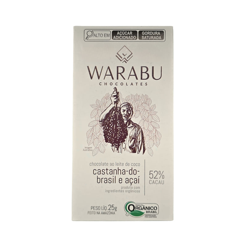 <p>O <strong>chocolate Wabaru 52% cacau ao leite de coco</strong>, com castanha do Brasil e açaí é desenvolvido com ingredientes naturais selecionados, orgânicos, livres de glúten e de lactose. Cada mordida proporciona uma explosão de sabores, com notas suaves e textura cremosa.</p> <h2><strong>Sugestão de consumo:</strong></h2> <p>Super versátil, o chocolate Wabaru pode ser consumido como sobremesa ou fazendo parte de receitas culinárias.</p> <h2><strong>Motivos para escolher o produto:</strong></h2> <ul> <li> <p>Embalagem com 25g;</p> </li> <li> <p>Ingredientes orgânicos;</p> </li> <li> <p>Clean-label;</p> </li> <li> <p>Vegano;</p> </li> <li> <p>Sem OGM (organismos geneticamente modificados);</p> </li> <li> <p>Sem conservantes, adoçantes e aromas artificiais;</p> </li> <li> <p>Livre de glúten, soja e leite;</p> </li> <li> <p>Feito com o método Bean to bar: utiliza poucos ingredientes, resultando em um chocolate mais puro, pouco processado, muito mais saboroso e nutritivo.</p> </li> </ul> <h2><strong>A Marca</strong></h2> <p>A Wabaru foi fundada pelo chef e empresário Jorge Neves no ano de 2018, a marca nasceu com o propósito de resgatar a cultura do cultivo do cacau na Amazônia. Cada chocolate é desenvolvido com cacau selvagem orgânico, de espécie nativa, situada na bacia Amazônica, garantindo um chocolate rico em sabor, responsabilidade e compromisso com a natureza e as pessoas que nela vivem.</p> <p> </p>