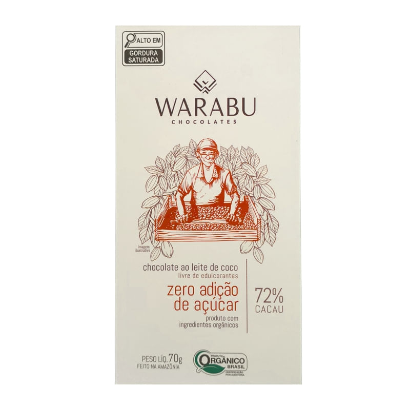 <p>O <strong>chocolate Wabaru 72% cacau ao leite de coco zero adição de açúcares</strong> é desenvolvido com ingredientes naturais selecionados, orgânicos, livres de glúten e de lactose. Cada mordida proporciona uma explosão de sabores, com notas intensas e delicadas, além de muita cremosidade.</p> <h2><strong>Sugestão de consumo:</strong></h2> <p>Super versátil, o chocolate Wabaru pode ser consumido como sobremesa ou fazendo parte de receitas culinárias.</p> <h2><strong>Motivos para escolher o produto:</strong></h2> <ul> <li> <p>Embalagem com 70g;</p> </li> <li> <p>Zero adição de açúcares;</p> </li> </ul> <ul> <li> <p>Clean-label;</p> </li> <li> <p>Vegano;</p> </li> <li> <p>Sem OGM (organismos geneticamente modificados);</p> </li> <li> <p>Sem conservantes, adoçantes e aromas artificiais;</p> </li> <li> <p>Livre de glúten, soja e leite;</p> </li> <li> <p>Feito com o método Bean to bar: utiliza poucos ingredientes, resultando em um chocolate mais puro, pouco processado, muito mais saboroso e nutritivo.</p> </li> </ul> <h2><strong>A Marca</strong></h2> <p>A Wabaru foi fundada pelo chef e empresário Jorge Neves no ano de 2018, a marca nasceu com o propósito de resgatar a cultura do cultivo do cacau na Amazônia. Cada chocolate é desenvolvido com cacau selvagem orgânico, de espécie nativa, situada na bacia Amazônica, garantindo um chocolate rico em sabor, responsabilidade e compromisso com a natureza e as pessoas que nela vivem.</p> <p> </p>