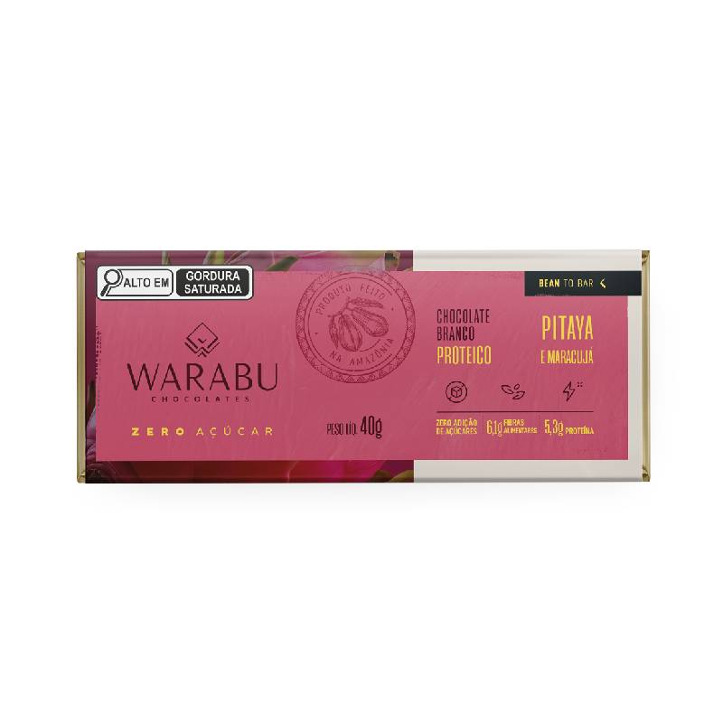 <p>O <strong>tablete de chocolate branco com pitaya e maracujá da Wabaru</strong> é feito com ingredientes naturais e sem adição de açúcares. Ele possui proteína de arroz na composição, o que garante um chocolate proteico e rico em fibras alimentares. </p> <h2><strong>Sugestão de consumo:</strong></h2> <p>Super versátil, o chocolate branco Wabaru pode ser consumido como sobremesa ou fazendo parte de receitas culinárias.</p> <h2><strong>Motivos para escolher o produto:</strong></h2> <ul> <li> <p>Embalagem com 40g;</p> </li> <li> <p>Vegano;</p> </li> <li> <p>Zero açúcar;</p> </li> <li> <p>Proteico: 5,3g por porção;</p> </li> <li> <p>Fonte de fibras alimentares;</p> </li> <li> <p>Clean-label;</p> </li> <li> <p>Sem OGM (organismos geneticamente modificados);</p> </li> <li> <p>Sem conservantes, adoçantes e aromas artificiais;</p> </li> <li> <p>Livre de glúten, soja e leite;</p> </li> <li> <p>Feito com o método Bean to bar: utiliza poucos ingredientes, resultando em um chocolate mais puro, pouco processado, muito mais saboroso e nutritivo.</p> </li> </ul> <h2><strong>A Marca</strong></h2> <p>A Wabaru foi fundada pelo chef e empresário Jorge Neves no ano de 2018, a marca nasceu com o propósito de resgatar a cultura do cultivo do cacau na Amazônia. Cada chocolate é desenvolvido com cacau selvagem orgânico, de espécie nativa, situada na bacia Amazônica, garantindo um chocolate rico em sabor, responsabilidade e compromisso com a natureza e as pessoas que nela vivem.</p> <p> </p>