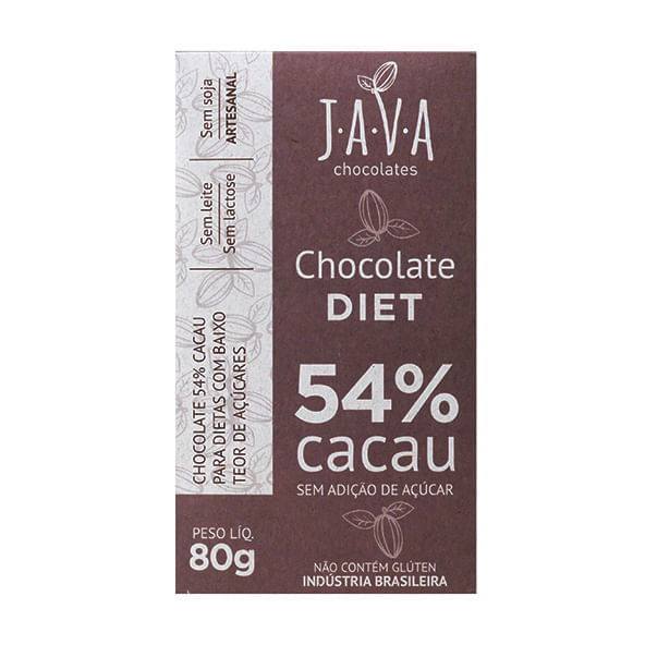 Informações técnicas sobre o produto:<br> O Chocolate 54% Cacau Diet 80g, da Java Chocolate é um produto com o cacau da Amazônia, um chocolate cremoso sem adição de açúcar. São utilizados poucos ingredientes, assim, enriquecendo o chocolate e proporcionando um sabor leve e adocicado.<br> <br> Recomendação de consumo:<br> Uma ótima opção de doce para consumir a qualquer hora ao longo dia. Pode ser utilizado para a preparação de sobremesas, bebidas e caldas.<br> <br> Informações sobre alergênicos:<br> Contém traços de amêndoas.<br> <br> Por que escolher esse produto?<br> Não contém glúten<br> Sem soja<br> Sem leite<br> Sem lactose<br> Sem adição de açúcar<br> Alto teor de cacau<br> Livre de gordura trans<br> Sobre a marca:<br> A Java Chocolates foi criada por um casal que acredita que a alimentação é ainda mais prazerosa quando é saudável. Ao longo do tempo, descobriram que era possível ter uma alimentação saudável e prática, sem abrir mão do sabor e da naturalidade. Os produtos são feitos artesanalmente em pequenas quantidades a partir do cacau orgânico de origem amazônica, prestando toda atenção aos detalhes e prezando a qualidade, higiene e segurança alimentar.