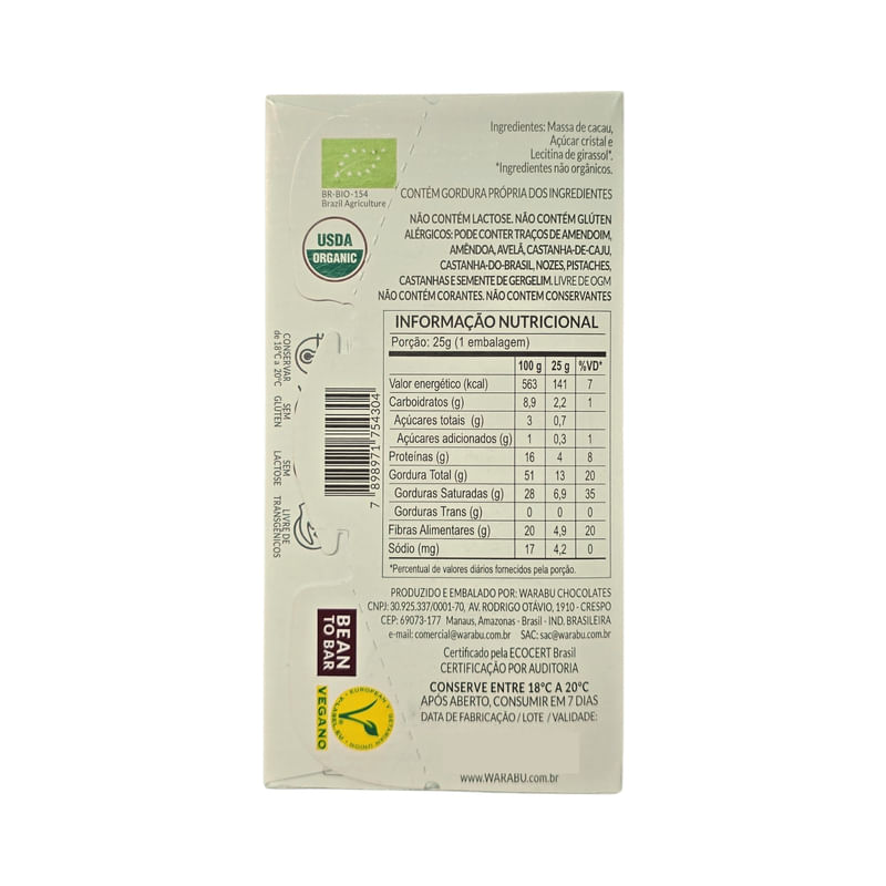 <p>O<strong> chocolate extra amargo Wabaru 99% cacau</strong> é desenvolvido com cacau selvagem da <strong>comunidade Tauaré </strong>e outros ingredientes naturais selecionados, orgânicos, livres de glúten e de lactose. Cada mordida proporciona uma explosão de sabores e aromas.</p> <h2><strong>Sugestão de consumo:</strong></h2> <p>Super versátil, o chocolate Wabaru pode ser consumido como sobremesa ou fazendo parte de receitas culinárias.</p> <h2><strong>Motivos para escolher o produto:</strong></h2> <ul> <li> <p>Embalagem com 25g;</p> </li> <li> <p>Ingredientes orgânicos;</p> </li> <li> <p>Clean-label;</p> </li> <li> <p>Vegano;</p> </li> <li> <p>Sem OGM (organismos geneticamente modificados);</p> </li> <li> <p>Sem conservantes, adoçantes e aromas artificiais;</p> </li> <li> <p>Livre de glúten, soja e leite;</p> </li> <li> <p>Feito com o método Bean to bar: utiliza poucos ingredientes, resultando em um chocolate mais puro, pouco processado, muito mais saboroso e nutritivo.</p> </li> </ul> <h2><strong>A Marca</strong></h2> <p>A Wabaru foi fundada pelo chef e empresário Jorge Neves no ano de 2018, a marca nasceu com o propósito de resgatar a cultura do cultivo do cacau na Amazônia. Cada chocolate é desenvolvido com cacau selvagem orgânico, de espécie nativa, situada na bacia Amazônica, garantindo um chocolate rico em sabor, responsabilidade e compromisso com a natureza e as pessoas que nela vivem.</p> <p> </p>