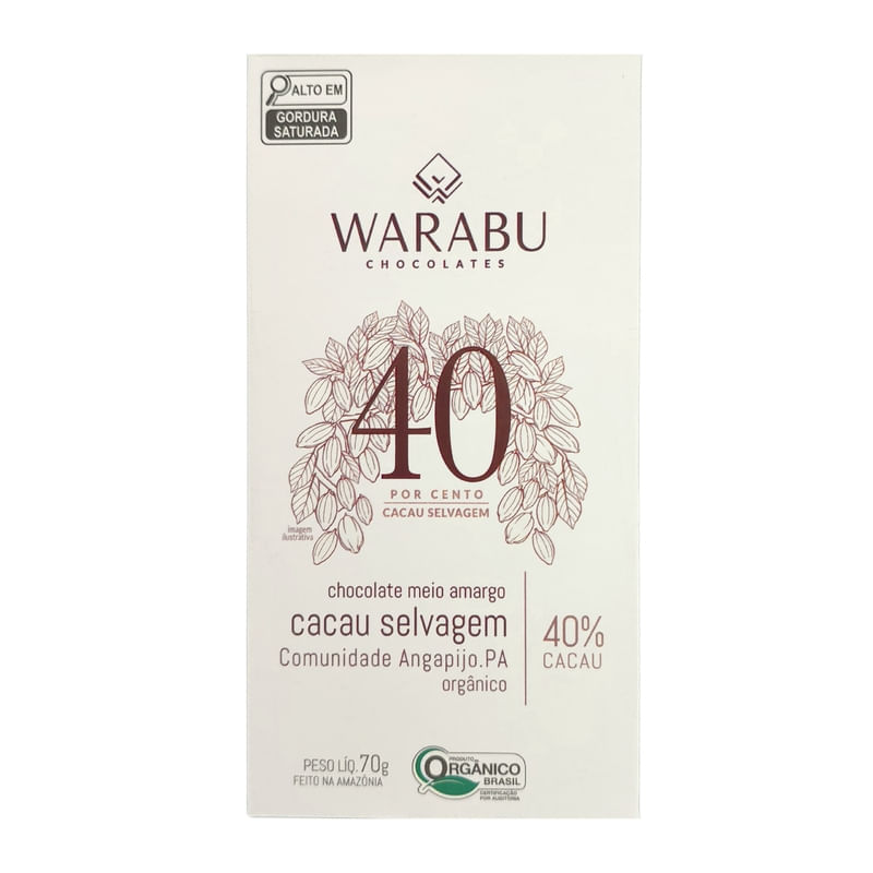 <p>O <strong>chocolate Wabaru 40% cacau</strong> é desenvolvido com cacau selvagem da comunidade Angapijo e outros ingredientes naturais selecionados, orgânicos, livres de glúten e de lactose. Cada mordida proporciona uma explosão de sabores e cremosidade intensa.</p> <h2><strong>Sugestão de consumo:</strong></h2> <p>Super versátil, o chocolate Wabaru pode ser consumido como sobremesa ou fazendo parte de receitas culinárias.</p> <h2><strong>Motivos para escolher o produto:</strong></h2> <ul> <li> <p>Embalagem com 70g;</p> </li> <li> <p>Ingredientes orgânicos;</p> </li> <li> <p>Clean-label;</p> </li> <li> <p>Vegano;</p> </li> <li> <p>Sem OGM (organismos geneticamente modificados);</p> </li> <li> <p>Sem conservantes, adoçantes e aromas artificiais;</p> </li> <li> <p>Livre de glúten, soja e leite;</p> </li> <li> <p>Feito com o método Bean to bar: utiliza poucos ingredientes, resultando em um chocolate mais puro, pouco processado, muito mais saboroso e nutritivo.</p> </li> </ul> <h2><strong>A Marca</strong></h2> <p>A Wabaru foi fundada pelo chef e empresário Jorge Neves no ano de 2018, a marca nasceu com o propósito de resgatar a cultura do cultivo do cacau na Amazônia. Cada chocolate é desenvolvido com cacau selvagem orgânico, de espécie nativa, situada na bacia Amazônica, garantindo um chocolate rico em sabor, responsabilidade e compromisso com a natureza e as pessoas que nela vivem.</p>