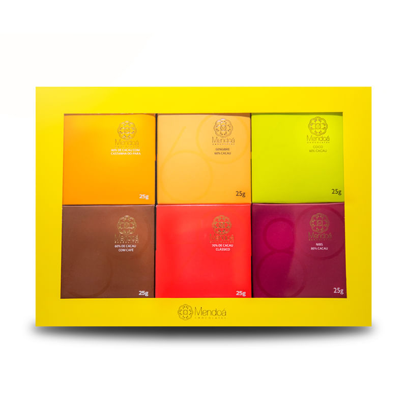 <p>Informações técnicas do produto:<br>O Chocolate Mix Com 6 Sabores 25g, da Mendoá, é uma linha que compõe mix de chocolate, que reúne diversos sabores clássicos do puro cacau em uma única caixa. É um produto para apreciadores que buscam uma sensação do sabor suave ao mais intenso. É uma versão para presentear alguém especial. <br><br>Recomendação de consumo:<br>Uma ótima opção de doce saudável e poderá ser consumido a qualquer hora ao longo dia. E pode ser utilizado para a preparação de sobremesas, bebidas e caldas.<br><br>Por que escolher esse produto?<br>Possui alto teor de cacau<br>Não contém glúten<br>Não contém lactose<br>Sem conservantes<br>Livre de gorduras trans<br>100% natural<br>Sem adoçantes, aromatizantes e corantes artificiais<br>Informações sobre alergênicos:<br>Contém lecitina de soja. Pode conter traços de leite e traços de castanhas.<br><br>Sobre a marca<br>Os Chocolates Mendoá são preciosidades concebidas em plena Floresta Atlântica brasileira. A partir de amêndoas de cacau selecionadas e com o uso de tecnologia de vanguarda, todas as etapas acontecem na Fazenda Riachuelo, em Ilhéus, Bahia, Brasil – do cultivo do cacau até a embalagem para a sua apreciação. Nesta fazenda, pratica-se o cultivo tradicional no sistema Cabruca, que consiste na implantação da cultura do cacau sob a proteção das árvores da Mata Atlântica, de forma descontínua e circundada por vegetação nativa.</p>