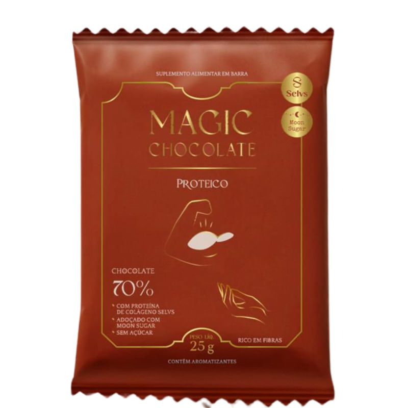 <p>A <strong>barra de chocolate Proteica 25g da Magic Chocolate</strong> é elaborada com chocolate 70% e proteína do colágeno, garantindo um chocolate saboroso e com 5g de proteína por porção, além disso é sem açúcares, isento de glúten e lactose.</p> <h2><strong>Sobre os ingredientes: </strong></h2> <p>Colágeno Grass Fed em pó: são peptídeos de colágeno hidrolisado Grass Fed tipo 1 e 3, proveniente de gado criado solto, é um colágeno altamente biodisponível e sustentável.</p> <h2><strong>Sugestão de consumo: </strong></h2> <p>Doce perfeito para garantir mais proteína no seu dia a dia, pode ser um pós treino ou em um lanche da tarde/manhã.</p> <h2><strong>Motivos para escolher o produto: </strong></h2> <ul> <li> <p>Contém 5g de proteína na porção;</p> </li> <li> <p>Feito com proteína de colágeno;</p> </li> <li> <p>Sem açúcares;</p> </li> <li> <p>Sem glúten e sem lactose;</p> </li> <li> <p>Adoçado com Moon Sugar - adoçante natural low fodmap;</p> </li> <li> <p>Feito com cacau da Amazônia;</p> </li> <li> <p>Prático para consumo: porção individual.</p> </li> </ul> <h2><strong>A marca:</strong></h2> <p>A Magic Chocolate foi fundada pela nutricionista Valentina B. Slaviero com o intuito de trazer a suplementação de uma forma prática e gostosa, o portfólio de produtos foi pensado para sanar as necessidades contemporâneas, como sono, falta de energia e ansiedade. A marca une prazer, indulgência e suplementação, através dos seus chocolates com ingredientes de qualidade e cheios de sabor.</p> <p><br><br></p>