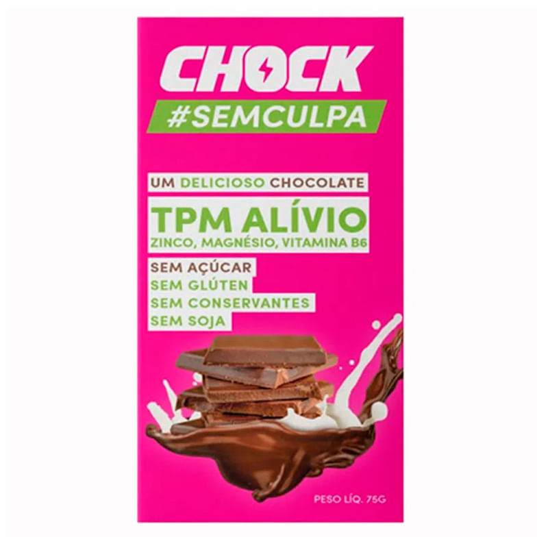 Informações técnicas do produto:<br> <br> Chock TPM Alívio, 75 g, da Chock, é um delicioso chocolate saudável e funcional, feito a partir de ingredientes naturais.<br> <br> Pensado para mulheres, ele é enriquecido com as vitaminas e os minerais que são mais necessários no período da TPM.<br> <br> Recomendação de consumo:<br> <br> Ideal para ser consumido após as principais refeições, principalmente no período da TPM.<br> <br> Por que escolher esse produto?<br> Sem açúcar<br> Sem glúten<br> Sem conservantes<br> Sem soja<br> Enriquecido com vitaminas<br> Sobre a marca:<br> <br> A Chock é uma empresa que tem como missão melhorar a vida das pessoas através da alimentação saudável, gostosa e sem culpa! Os produtos são feitos com tecnologia e ingredientes de alta qualidade, tudo isso visando oferecer opções saborosas e saudáveis ao consumidor.<br> <br>