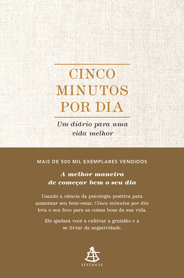 MAIS DE 500 MIL EXEMPLARES VENDIDOS.A melhor maneira de começar bem o seu dia.Usando a ciência da psicologia positiva para aumentar seu bem-estar, Cinco minutos por dia leva o seu foco para as coisas boas da sua vida. Ele ajudará você a cultivar a gratidão e a se livrar da negatividade.Cultivar a gratidão muda o modo como você se sente e como reage às situações. Como consequência, a negatividade vai embora. Fazendo isso pela manhã e ao se deitar, você vai estabelecer uma intenção positiva para o seu dia e refletir sobre o que viveu antes de dormir.Prático e inspirador, este diário é perfeito para quem quer se conhecer melhor e se abrir às oportunidades da vida. E tudo isso em apenas cinco minutos por dia!Cinco razões para adorar este diário:1- É a coisa mais simples e eficaz que você pode fazer todos os dias para ser mais feliz 2- Foi criado a partir de princípios comprovados da psicologia positiva 3- É um diário para pessoas que não escrevem diários 4- Você terá um retrato de seus dias, semanas, meses e anos 5- Acha difícil manter um compromisso? Tudo bem. Tudo isso é possível. Em menos de cinco minutos por dia.