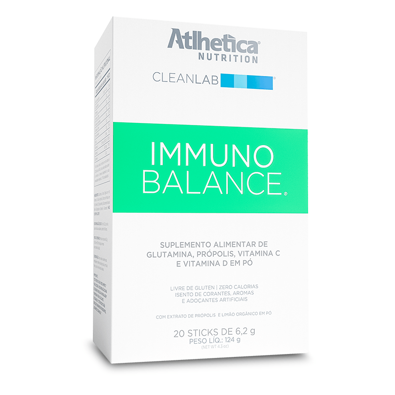 <p>O <strong>Cleanlab Immuno Balance Atlhetica 6,2g com 20 sachês</strong>, como o próprio nome propõe, é um suplemento que chega para trazer mais qualidade imune ao seu organismo. Um composto alimentar de glutamina, própolis, vitamina C, vitamina D e outros que não permitirá que seu sistema imunológico seja acometido por gripes e outros males. Em formato stick e saboroso sabor, própolis e limão orgânico, pode ser servido frio ou quente como um chazinho fortalecedor!</p> Sobre os ingredientes: <p>Glutamina, Limão Orgânico em Pó, Vitamina C (Ácido Ascórbico), Extrato de Própolis em Pó, Vitamina D3 (Colecalciferol), Edulcorantes Naturais Reb A (Glicosídeos de Esteviol) e Taumatina. Não contém Glúten.</p> Sugestão de consumo: <p>1 stick (6,2g) ao dia, para indivíduos saudáveis. Misturar em 150ml de água mineral até completa diluição.</p> Motivos para escolher o produto: <ul> <li> <p>Fortalecimento imune</p> </li> <li> <p>Fácil consumo (sticks em doses exatas)</p> </li> <li> <p>Delicioso sabor</p> </li> <li> <p>Qualidade Atlhetica Nutrition.</p> </li> </ul> Sobre a marca: <p>A <strong>Atlhetica</strong>, é uma empresa no qual os produtos são desenvolvidos pela ADS Laboratório Nutricional, que produz suplementos alimentares inovadores com alta qualidade e tecnologia avançada, é considerada a maior indústria de suplementos alimentares do Brasil. Os produtos são fabricados seguindo as normas estabelecidas pela ANVISA e pelas Boas Práticas de Fabricação, proporcionando a qualidade, bem-estar e eficácia.</p>