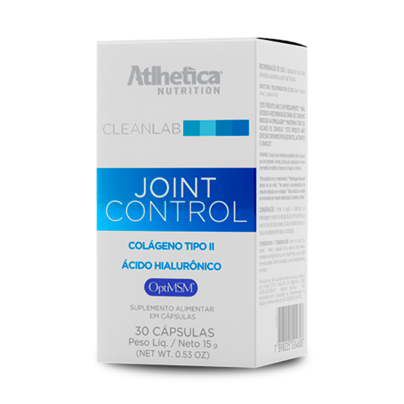 <p>A Atlhetica Nutrition desenvolveu o Joint Control® da linha Cleanlab® pensando em você que não quer desistir das atividades físicas, mas que sente as dores causadas por pequenas lesões ou pela diminuição da flexibilidade.</p> <p>O <strong>Cleanlab Joint Control Atlhetica com 30 cápsulas</strong>, é um excelente suplemento que auxilia na prevenção e recuperação de lesões nas articulações e tendões, que sofrem o impacto do dia a dia e tem desgaste natural do corpo auxiliando na lubrificação das articulações, reduzindo o atrito consequentemente, prevenindo e aliviando as dores.</p> Sobre os ingredientes: <p>Metilsulfonilmetano (msm), colágeno de frango tipo ii, ácido hialurônico, antiumectantes celulose microcristalina, estearato de magnésio e dióxido de silício, cápsula de gelatina (gelatina e água purificada). Não contém Glúten.</p> Motivos para escolher o produto: <ul> <li> <p>50mg de MSM</p> </li> <li> <p>40mg de Colágeno tipo II</p> </li> <li> <p>7mg de Ácido Hialurônico</p> </li> <li> <p>Sem Lactose</p> </li> <li> <p>Sem Açúcar</p> </li> <li> <p>Sem Calorias</p> </li> <li> <p>Sem glúten</p> </li> <li> <p>Sem Gordura</p> </li> </ul> Sobre a marca: <p>A <strong>Atlhetica</strong>, é uma empresa no qual os produtos são desenvolvidos pela ADS Laboratório Nutricional, que produz suplementos alimentares inovadores com alta qualidade e tecnologia avançada, é considerada a maior indústria de suplementos alimentares do Brasil. Os são fabricados seguindo as normas estabelecidas pela ANVISA (Agência Nacional de Vigilância Sanitária) e pelas Boas Práticas de Fabricação (BPF), proporcionando a qualidade, bem-estar e a eficácia que os consumidores tanto desejam.</p>