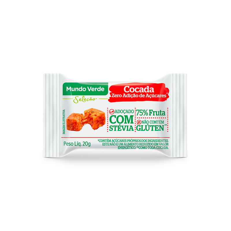 Informações técnicas do produto:<br> A Cocada zero Mundo Verde Seleção, é um doce composto por 75% de coco, sem adição de açúcar, livre de glúten, aromatizantes e corantes artificiais. Uma alternativa de sobremesa saudável e rica em fibras. <br> <br> Alérgicos:<br> Pode conter leite, amêndoas, castanha de caju, castanha-do-pará, avelã, amendoim, nozes e derivado de soja.<br> <br> Recomendação de consumo:<br> Ótima opção de doce ou sobremesa saudável e pratica para ser consumida em momentos do dia. <br> <br> Motivos para escolher esse produto?<br> 3,8 g de fibras<br> Sem glúten<br> 75% fruta<br> Sem aromatizantes e corantes artificiais<br> Informações sobre a marca:<br> A Mundo Verde Seleção é uma linha de produtos para quem quer ter uma vida mais saudável e gostosa. A marca quer ajudar a colocar essas escolhas em prática. A paixão e conhecimento pelos alimentos, nutrientes, aromas e sabores permitem a seleção das melhores opções saudáveis para qualquer ocasião. Conheça a linha completa Mundo Verde Seleção, com inúmeros produtos saudáveis e gostosos para facilitar seu dia a dia.