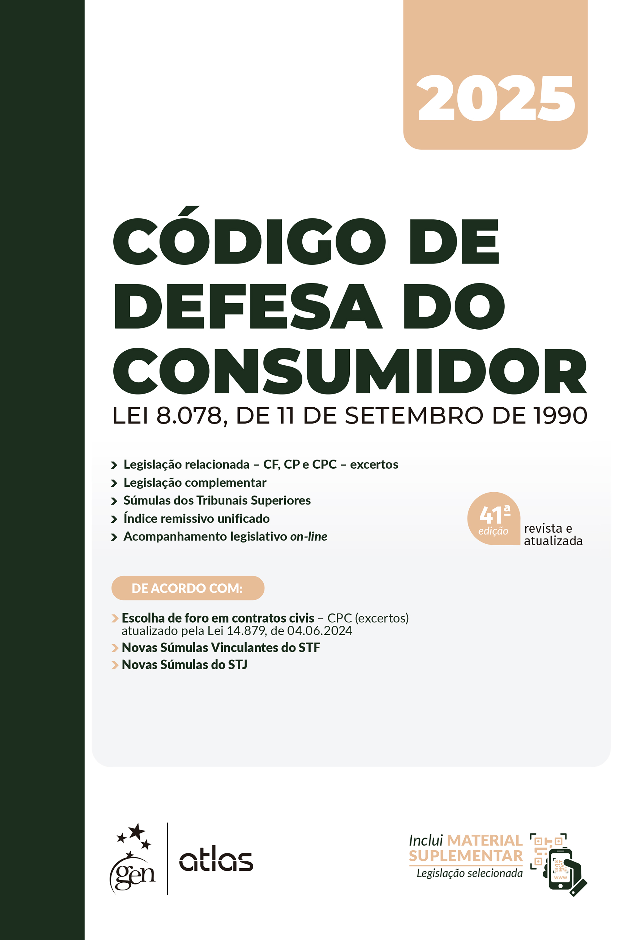 Este Código de Defesa do Consumidor consolida décadas de tradição do Grupo Editorial Nacional | Editora Atlas na publicação de livros jurídicos. Confiantes em superar os constantes desafios, entregamos ao público um material consistente, funcional e atualizado, com um projeto gráfico prático e moderno, que permite a otimização na busca de informações. Trata-se de legislação criteriosamente selecionada e organizada para atender a estudantes, candidatos a concursos públicos, técnicos e profissionais do Direito e das mais diversas áreas do conhecimento. Aos adquirentes desta edição do Código de Defesa do Consumidor, é oferecido material suplementar exclusivo e gratuito para download, com acesso via QR Code nas iniciais do livro. Além disso, o GEN disponibiliza para seus leitores um acompanhamento legislativo on-line, com informações sobre as normas de maior impacto nos principais ramos do Direito brasileiro, bem como aquelas que alterem os dispositivos legais contidos nesta obra, publicadas ao longo do ano. ?