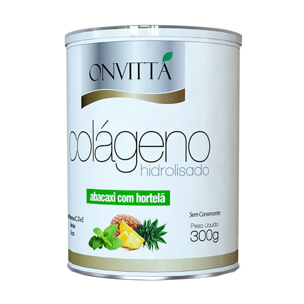 Informações técnicas do produto:<br> O Colágeno Hidrolisado sabor abacaxi com hortelã, da Onvittá, 300g, é hidrolisado com 9.6 % de Peptídeos de colágeno puro por porção de 10g, facilmente absorvido pelo organismo.<br> <br> Matéria prima qualificada, importada e com tecnologia francesa. É composto por um blend exclusivo de Vitamina C, Selênio, Zinco, Vitaminas A, E e D.<br> <br> Atende 100% das recomendações diárias de vitamina A, vitamina D, vitamina C, vitamina E, selênio e zinco na porção. <br> <br> Recomendação de consumo:<br> Dissolva 10g (1 dosador) do produto em pó em 200ml de água, mexa até completa dissolução. Pode ser consumido com suco, iogurte, leite ou a bebida de sua preferência.<br> <br> Beba imediatamente após o preparo.<br> <br> Informações sobre alergênicos:<br> Pode conter derivados do leite de vaca, soja, cevada, ovos e látex natural.<br> <br> Por que escolher esse produto?<br> Sem conservantes<br> Sem corantes artificiais<br> Sem glúten<br> Sem lactose<br> Sem açúcares<br> Adoçado com sucralose<br> Sobre a marca<br> A OnVittá, surgiu para proporcionar bem-estar, saúde e beleza a todas as pessoas que desejam a maior qualidade de vida possível. A marca fornece produtos especialmente desenvolvidos por médicos e nutricionistas, disponibilizando uma linha diferenciada de colágenos hidrolisados, chás e sucos verdes.