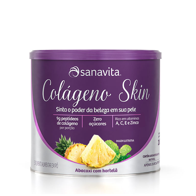 O Colágeno skin sabor Abacaxi com Hortelã, da Sanavita, é um suplemento alimentar que fornece 9g de peptídeos ativos de colágeno combinada a vitaminas e minerais.<br>Atende 100% das necessidades diárias das vitaminas A, C, E e o mineral zinco. Não possui adição de açúcar ou maltodextrina.<br>Sobre os ingredientes:<br>• Peptídeos de colágeno: é o colágeno reduzido em pequenas partículas, tornando a absorção pelo organismo mais fácil. Os aminoácidos presentes no colágeno compõem a estrutura de tecidos, tais como o da pele, ossos, cartilagens e ligamentos.<br>• Vitaminas A, C, E e o mineral zinco: apresentam ação antioxidante que auxilia na proteção dos danos causados pelos radicais livres.<br>• Vitamina C: auxilia na formação do colágeno.<br>• Vitamina A e zinco: a vitamina A contribui para a manutenção da pele, e o zinco, além da pele, contribui para a manutenção do cabelo e das unhas.<br>Alérgicos:<br>Pode conter derivados de leite e de soja.<br>Recomendação de consumo:<br>Adicione 1 porção (10 g) em 200 mL de água, leite, sucos, iogurtes ou bebida de sua preferência e mexa até completa dissolução. <br>Sugere-se o consumo de 1 porção ao dia. <br>Por que escolher este produto?<br>• Sem glúten<br>• Sem lactose<br>• 36 kcal na porção<br>• Livre de conservantes, corantes ou aromas artificiais<br>• Não contém maltodextrina<br>• Baixo índice glicêmico<br>• Low carb<br>• Baixo FODMAP<br>Sobre a marca: <br>A Sanavita é uma das principais empresas produtoras de alimentos saudáveis do Brasil, especializada no desenvolvimento de alimentos funcionais e especiais. Graças a excelente qualidade de seus produtos e à sua origem científica, conquistou a fidelidade dos profissionais de saúde e dos consumidores em todo o país.