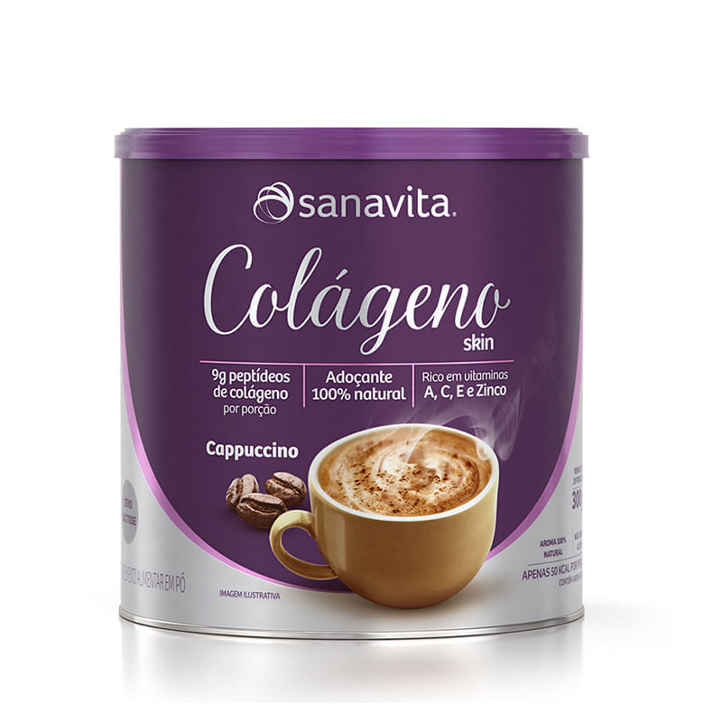 O Colágeno skin sabor Cappuccino, da Sanavita, é um suplemento alimentar que fornece 9g de peptídeos ativos de colágeno combinada a vitaminas e minerais, além do cacau, café e canela, característicos deste delicioso sabor.<br>Atende 100% das necessidades diárias das vitaminas A, C, E e o mineral zinco. Não possui adição de açúcar ou maltodextrina.<br>Sobre os ingredientes:<br>• Peptídeos de colágeno: é o colágeno reduzido em pequenas partículas, tornando a absorção pelo organismo mais fácil. Os aminoácidos presentes no colágeno compõem a estrutura de tecidos, tais como o da pele, ossos, cartilagens e ligamentos.<br>• Vitaminas A, C, E e o mineral zinco: apresentam ação antioxidante que auxilia na proteção dos danos causados pelos radicais livres.<br>• Vitamina C: auxilia na formação do colágeno.<br>• Vitamina A e zinco: a vitamina A contribui para a manutenção da pele, e o zinco, além da pele, contribui para a manutenção do cabelo e das unhas.<br>Alérgicos:<br>Pode conter derivados de leite e de soja.<br>Recomendação de consumo:<br>Adicione 1 porção (10 g) em 150 mL de água, leite, sucos, iogurtes ou bebida de sua preferência e mexa até completa dissolução. <br>Sugere-se o consumo de 1 porção ao dia. <br>Dica: experimente no no café da manhã ou antes de dormir. Pode ser consumido quente ou frio.<br>Por que escolher este produto?<br>• Sem glúten<br>• Sem lactose<br>• 36 kcal na porção<br>• Livre de conservantes, corantes ou aromas artificiais<br>• Não contém maltodextrina<br>• Baixo índice glicêmico<br>• Low carb<br>• Adoçado com stévia<br>Sobre a marca: <br>A Sanavita é uma das principais empresas produtoras de alimentos saudáveis do Brasil, especializada no desenvolvimento de alimentos funcionais e especiais. Graças a excelente qualidade de seus produtos e à sua origem científica, conquistou a fidelidade dos profissionais de saúde e dos consumidores em todo o país.