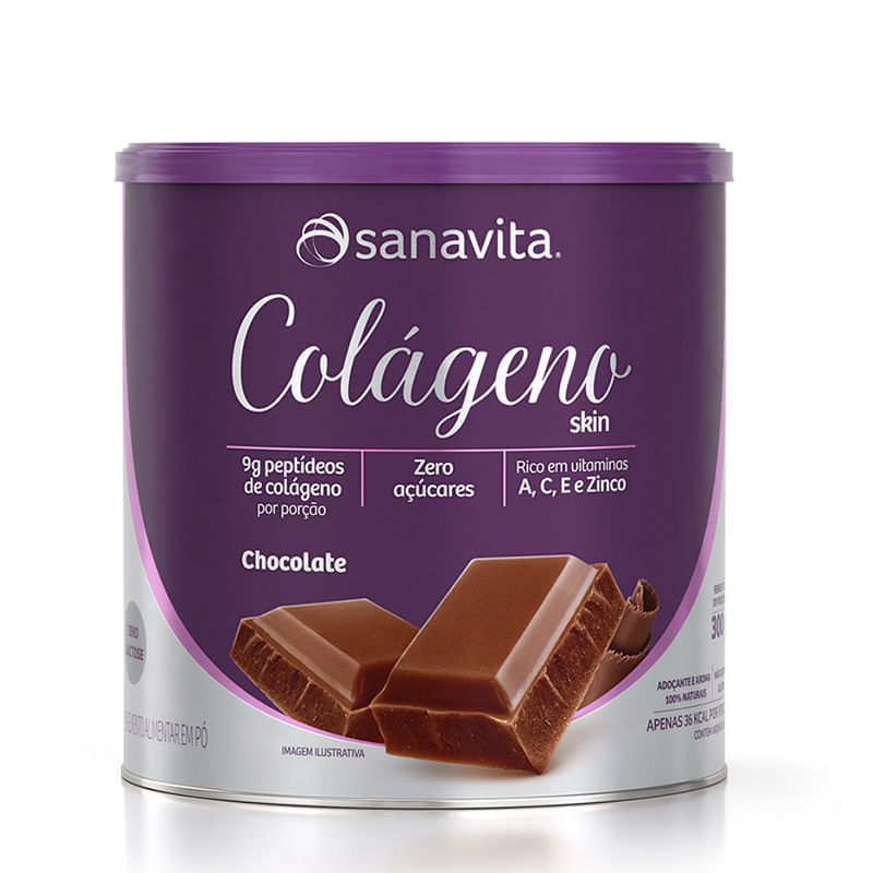 O Colágeno skin sabor Chocolate, da Sanavita, é um suplemento alimentar que fornece 9g de peptídeos ativos de colágeno combinada a vitaminas e minerais.<br>Atende 100% das necessidades diárias das vitaminas A, C, E e o mineral zinco. Não possui adição de açúcar ou maltodextrina.<br>Sobre os ingredientes:<br>• Peptídeos de colágeno: é o colágeno reduzido em pequenas partículas, tornando a absorção pelo organismo mais fácil. Os aminoácidos presentes no colágeno compõem a estrutura de tecidos, tais como o da pele, ossos, cartilagens e ligamentos.<br>• Vitaminas A, C, E e o mineral zinco: apresentam ação antioxidante que auxilia na proteção dos danos causados pelos radicais livres.<br>• Vitamina C: auxilia na formação do colágeno.<br>• Vitamina A e zinco: a vitamina A contribui para a manutenção da pele, e o zinco, além da pele, contribui para a manutenção do cabelo e das unhas.<br>Alérgicos:<br>Pode conter derivados de leite e de soja.<br>Recomendação de consumo:<br>Adicione 1 porção (10 g) em 150 mL de água, leite, sucos, iogurtes ou bebida de sua preferência e mexa até completa dissolução. <br>Sugere-se o consumo de 1 porção ao dia. <br>Dica: pode ser consumido quente ou frio.<br>Por que escolher este produto?<br>• Sem glúten<br>• Sem lactose<br>• 36 kcal na porção<br>• Livre de conservantes, corantes ou aromas artificiais<br>• Não contém maltodextrina<br>• Baixo índice glicêmico<br>• Low carb<br>• Adoçado com stévia<br>• Baixo FODMAP<br>Sobre a marca: <br>A Sanavita é uma das principais empresas produtoras de alimentos saudáveis do Brasil, especializada no desenvolvimento de alimentos funcionais e especiais. Graças a excelente qualidade de seus produtos e à sua origem científica, conquistou a fidelidade dos profissionais de saúde e dos consumidores em todo o país.