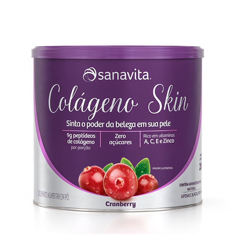 O Colágeno skin sabor Cranberry, da Sanavita, é um suplemento alimentar que fornece 9g de peptídeos ativos de colágeno combinada a vitaminas e minerais.<br>Atende 100% das necessidades diárias das vitaminas A, C, E e o mineral zinco. Não possui adição de açúcar ou maltodextrina.<br>Sobre os ingredientes:<br>• Peptídeos de colágeno: é o colágeno reduzido em pequenas partículas, tornando a absorção pelo organismo mais fácil. Os aminoácidos presentes no colágeno compõem a estrutura de tecidos, tais como o da pele, ossos, cartilagens e ligamentos.<br>• Vitaminas A, C, E e o mineral zinco: apresentam ação antioxidante que auxilia na proteção dos danos causados pelos radicais livres.<br>• Vitamina C: auxilia na formação do colágeno.<br>• Vitamina A e zinco: a vitamina A contribui para a manutenção da pele, e o zinco, além da pele, contribui para a manutenção do cabelo e das unhas.<br>Alérgicos:<br>Pode conter derivados de leite e de soja.<br>Recomendação de consumo:<br>Adicione 1 porção (10 g) em 150 mL de água, leite, sucos, iogurtes ou bebida de sua preferência e mexa até completa dissolução. <br>Sugere-se o consumo de 1 porção ao dia. <br>Por que escolher este produto?<br>• Sem glúten<br>• Sem lactose<br>• 36 kcal na porção<br>• Livre de conservantes, corantes ou aromas artificiais<br>• Não contém maltodextrina<br>• Baixo índice glicêmico<br>• Low carb<br>• Baixo FODMAP<br>• Adoçado com stévia<br>Sobre a marca: <br>A Sanavita é uma das principais empresas produtoras de alimentos saudáveis do Brasil, especializada no desenvolvimento de alimentos funcionais e especiais. Graças a excelente qualidade de seus produtos e à sua origem científica, conquistou a fidelidade dos profissionais de saúde e dos consumidores em todo o país.