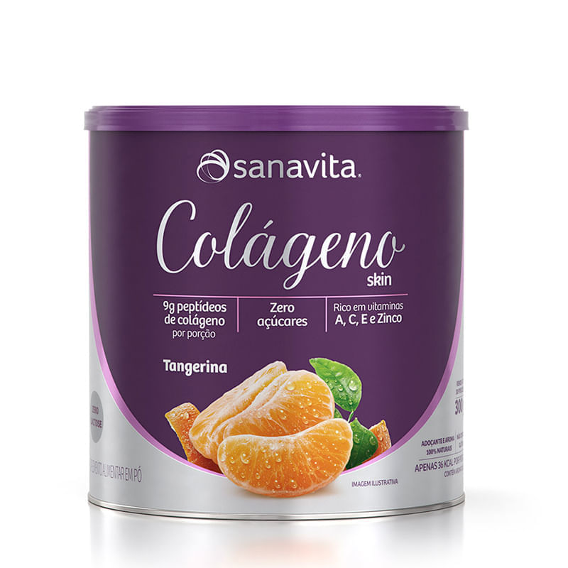 O Colágeno skin sabor Tangerina, da Sanavita, é um suplemento alimentar que fornece 9g de peptídeos ativos de colágeno combinada a vitaminas e minerais.<br>Atende 100% das necessidades diárias das vitaminas A, C, E e o mineral zinco. Não possui adição de açúcar ou maltodextrina.<br>Sobre os ingredientes:<br>• Peptídeos de colágeno: é o colágeno reduzido em pequenas partículas, tornando a absorção pelo organismo mais fácil. Os aminoácidos presentes no colágeno compõem a estrutura de tecidos, tais como o da pele, ossos, cartilagens e ligamentos.<br>• Vitaminas A, C, E e o mineral zinco: apresentam ação antioxidante que auxilia na proteção dos danos causados pelos radicais livres.<br>• Vitamina C: auxilia na formação do colágeno.<br>• Vitamina A e zinco: a vitamina A contribui para a manutenção da pele, e o zinco, além da pele, contribui para a manutenção do cabelo e das unhas.<br>Alérgicos:<br>Pode conter derivados de leite e de soja.<br>Recomendação de consumo:<br>Adicione 1 porção (10 g) em 200 mL de água, leite, sucos, iogurtes ou bebida de sua preferência e mexa até completa dissolução. <br>Sugere-se o consumo de 1 porção ao dia. <br>Por que escolher este produto?<br>• Sem glúten<br>• Sem lactose<br>• 36 kcal na porção<br>• Livre de conservantes, corantes ou aromas artificiais<br>• Não contém maltodextrina<br>• Baixo índice glicêmico<br>• Low carb<br>• Baixo FODMAP<br>Sobre a marca: <br>A Sanavita é uma das principais empresas produtoras de alimentos saudáveis do Brasil, especializada no desenvolvimento de alimentos funcionais e especiais. Graças a excelente qualidade de seus produtos e à sua origem científica, conquistou a fidelidade dos profissionais de saúde e dos consumidores em todo o país.