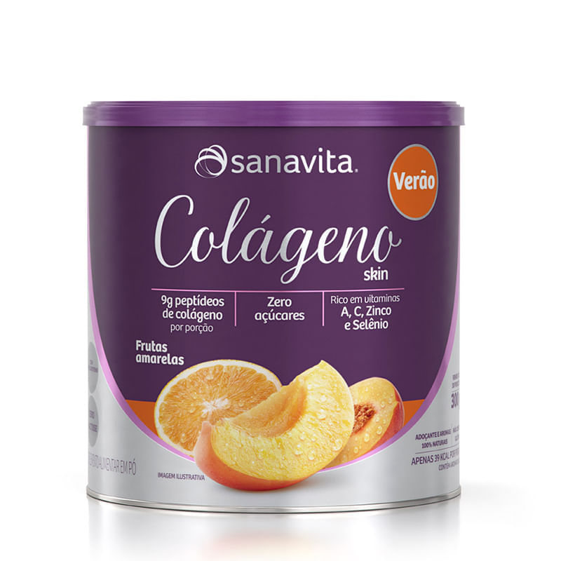 O Colágeno skin Verão sabor Frutas amarelas, da Sanavita, é um suplemento alimentar que fornece 9g de peptídeos ativos de colágeno combinada a vitaminas e minerais, sem adição de açúcar.<br>Atende 100% das necessidades diárias das vitaminas A, C, E e o mineral zinco, possui adição de betacaroteno para potencializar a sua beleza no verão. <br>Sobre os ingredientes:<br>• Peptídeos de colágeno: é o colágeno reduzido em pequenas partículas, tornando a absorção pelo organismo mais fácil. Os aminoácidos presentes no colágeno compõem a estrutura de tecidos, tais como o da pele, ossos, cartilagens e ligamentos.<br>• Betacaroteno: pigmento natural dos alimentos amarelos e alaranjados, é um antioxidante natural, precursor da vitamina A.<br>• Vitaminas A, C, E e o mineral zinco: apresentam ação antioxidante que auxilia na proteção dos danos causados pelos radicais livres.<br>• Vitamina C: auxilia na formação do colágeno.<br>• Vitamina A e zinco: a vitamina A contribui para a manutenção da pele, e o zinco, além da pele, contribui para a manutenção do cabelo e das unhas.<br>Alérgicos:<br>Pode conter derivados de leite e de soja.<br>Recomendação de consumo:<br>Adicione 1 porção (10 g) em 150 mL de água, leite, sucos, iogurtes ou bebida de sua preferência e mexa até completa dissolução. <br>Sugere-se o consumo de 1 porção ao dia. <br>Dica: o consumo deve ser diário e ao menos 20 dias antes da exposição ao sol.<br>Por que escolher este produto?<br>• Sem glúten<br>• Sem lactose<br>• 39 kcal na porção<br>• Livre de conservantes, corantes ou aromas artificiais<br>• Não contém maltodextrina<br>• Baixo índice glicêmico<br>• Low carb<br>• Baixo FODMAP<br>• Adoçado com stévia<br>Sobre a marca: <br>A Sanavita é uma das principais empresas produtoras de alimentos saudáveis do Brasil, especializada no desenvolvimento de alimentos funcionais e especiais. Graças a excelente qualidade de seus produtos e à sua origem científica, conquistou a fidelidade dos profissionais de saúde e dos consumidores em todo o país.