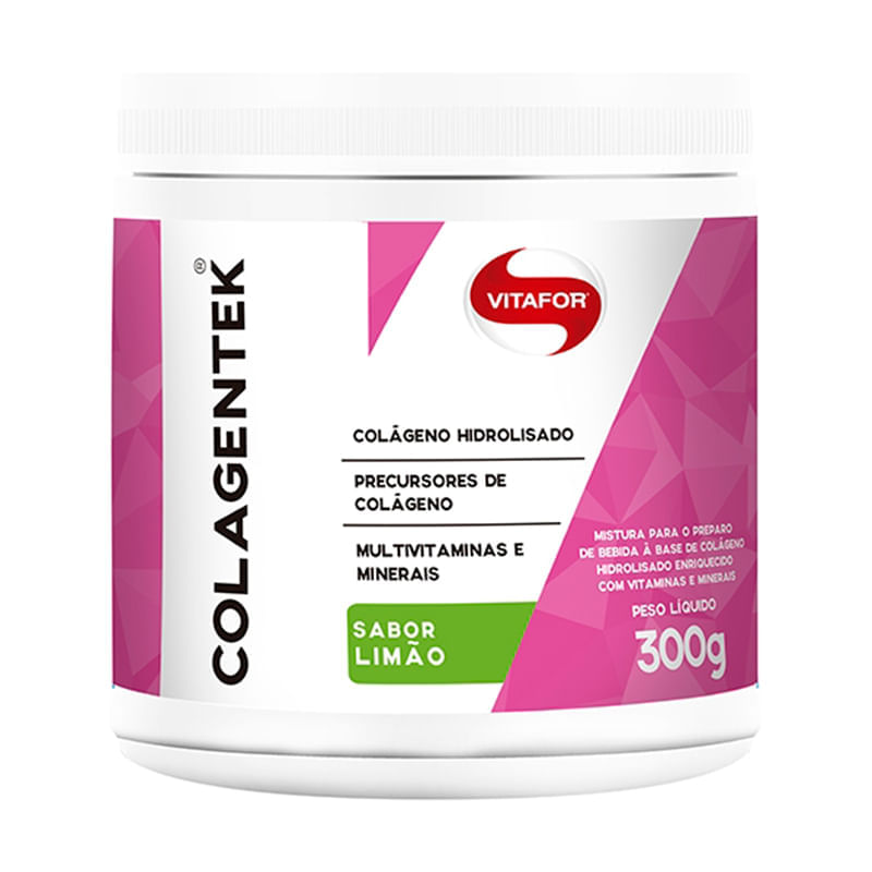 <p>O <strong>Colagentek Limão Vitafor 300g</strong>, é um suplemento alimentar formulado à partir de colágeno hidrolisado, e contém ainda, adição de vitaminas e minerais.</p> Sugestão de Consumo: <p>Dissolva 10g (um sachê ou uma colher medida) em aproximadamente 250ml (um copo) de água ou a bebida de sua preferência e agite com o auxílio de uma colher até a homogeneização total. Beba imediatamente após o preparo.</p> Motivos para escolher o produto: <ul> <li> <p>Sem adição de açúcar</p> </li> <li> <p>Com vitamina C</p> </li> <li> <p>Mix de minerais</p> </li> <li> <p>Oferece 9g de colágeno por dose</p> </li> <li> <p>Sem lactose</p> </li> </ul> Sobre a marca: <p>A <strong>Vitafor</strong> é uma marca nacional que está no mercado há mais de 10 anos. Tem como objetivo fabricar e desenvolver suplementos alimentares com padrão de alta qualidade e eficácia. Através de seus produtos, a <strong>Vitafor </strong>oferece confiança e eficácia nos produtos para complementar as necessidades nutricionais daqueles que se preocupam com a saúde, desempenho e bem-estar.</p>