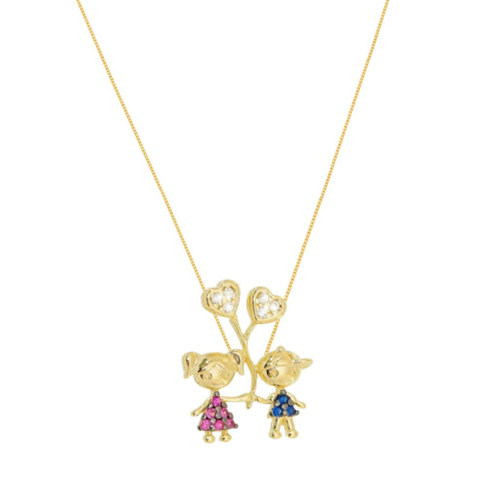 Colar com pingente de Filhos casal menino e menina com zirconias banhado em ouro 18k cordão mãe