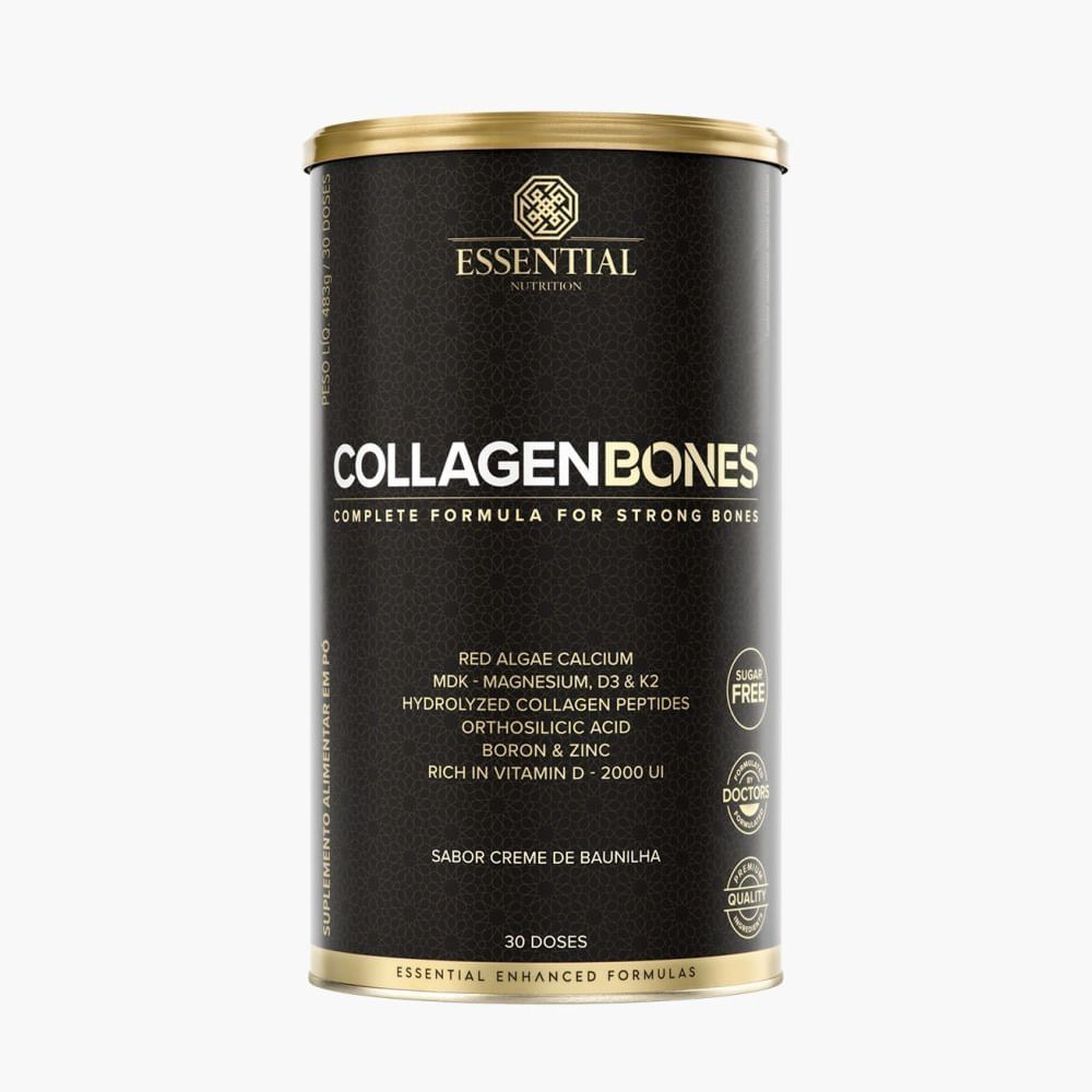 <p>O <strong>Collagen Bones sabor creme de baunilha Essential Nutrition</strong> é um suplemento formulado para oferecer suporte avançado à saúde óssea e articular. Sua composição exclusiva combina colágeno hidrolisado em peptídeos, cálcio marinho e o complexo MDK (magnésio quelado, vitamina D3 e vitamina K2), além de cofatores importantes, em uma união equilibrada que traduz ciência, tecnologia e qualidade em cada dose.</p> <h2 dir="ltr">Sobre os ingredientes:</h2> <ul> <li dir="ltr" aria-level="1"> <p><strong>Colágeno hidrolisado em peptídeos:</strong> proteína obtida por meio de um processo que facilita sua absorção, utilizada como suporte estrutural em diferentes tecidos do corpo.</p> </li> <li dir="ltr" aria-level="1"> <p><strong>Cálcio marinho:</strong> mineral extraído de algas vermelhas (Lithothamnion calcareum), fonte natural e diferenciada de cálcio.</p> </li> <li dir="ltr" aria-level="1"> <p><strong>MDK:</strong> combinação de magnésio quelado e das vitaminas D3 e K2, nutrientes que atuam de forma complementar para uma nutrição óssea completa.</p> </li> </ul> <h2 dir="ltr">Sugestão de consumo:</h2> <p>Dissolver 1 colher-medida (aprox. 16 g) em cerca de 200 ml de água ou na bebida de sua preferência, misturando até completa homogeneização. Consumir uma vez ao dia ou conforme orientação de profissional de saúde. </p> <h2 dir="ltr">Motivos para escolher o produto:</h2> <ul> <li dir="ltr" aria-level="1"> <p dir="ltr" role="presentation">2.000 UI de vitamina D;</p> </li> <li dir="ltr" aria-level="1"> <p dir="ltr" role="presentation">Com ácido ortosilícico e boro;</p> </li> <li dir="ltr" aria-level="1"> <p dir="ltr" role="presentation">Nutrientes com alta biodisponibilidade;</p> </li> <li dir="ltr" aria-level="1"> <p dir="ltr" role="presentation">Sabor suave de creme de baunilha;</p> </li> <li dir="ltr" aria-level="1"> <p dir="ltr" role="presentation">Livre de glúten e sem açúcares;</p> </li> <li dir="ltr" aria-level="1"> <p dir="ltr" role="presentation">Adoçado com stévia.</p> </li> </ul> <h2 dir="ltr">A Marca</h2> <p>A <strong>Essential Nutrition</strong> é uma marca especializada em nutrição funcional, produzindo produtos de extrema qualidade, utilizando as melhores matérias-primas e em suas concentrações ideias, excluindo o uso de ingredientes geneticamente modificados, glúten, lactose, corantes, conservantes e adoçantes artificiais.</p>