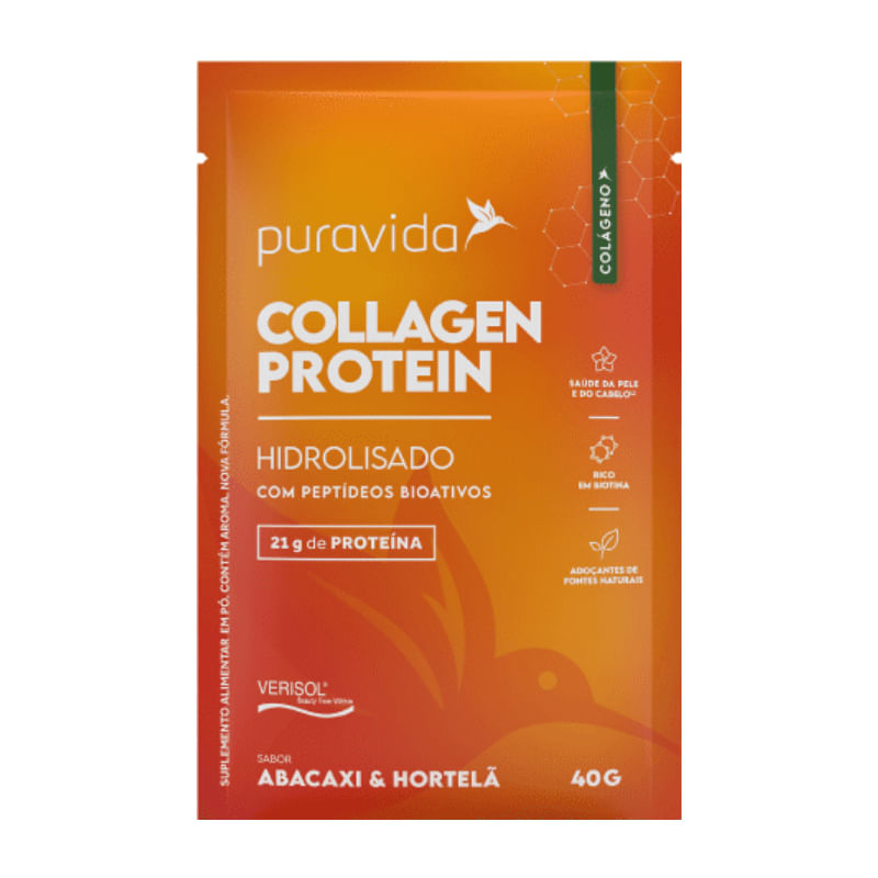 <p>O <strong>Collagen protein sabor abacaxi com hortelã Puravida</strong>, é um blend de ingredientes naturais como o colágeno hidrolisado e o colágeno Verisol®, que são uma fonte de proteína de ótima biodisponibilidade.</p> <h2>Sobre os ingredientes:</h2> <p><strong>Peptídeos de colágeno Verisol®:</strong> de acordo com estudos, é o tipo de colágeno direcionado para contribuir com a saúde da pele, cabelos e unhas.</p> <p><strong>Colágeno hidrolisado:</strong> oferta e proteína de fácil digestão, indicado para quem tem problemas digestivos com outras fontes de proteínas, como o whey protein.</p> <h2>Sugestão de consumo:</h2> <p>Adicione um scoop em 200ml de água ou bebidas e consuma. Pode ser utilizado entre as refeições e após atividades físicas. Pode ser consumido junto das principais refeições, como café, almoço ou jantar como um complemento da proteína.</p> <h2>Motivos para escolher o produto:</h2> <ul> <li> <p>Pode ser consumido após o exercício;</p> </li> <li> <p>Pode ser adicionado nas principais refeições como complemento de proteína;</p> </li> <li> <p>Contém 21g de proteína na porção;</p> </li> <li> <p>Elaborado com adoçantes naturais eritritol e taumatina;</p> </li> <li> <p>Sem conservantes, corantes e aromatizantes artificiais;</p> </li> <li> <p>Sem adição de açúcar.</p> </li> </ul> <h2>A Marca</h2> <p><strong>Puravida </strong>é uma empresa que nasceu com o propósito de facilitar a prática de um estilo de vida orgânico. Acreditam que a qualidade daquilo que escolhemos comer, pode afetar o funcionamento do nosso corpo, funcionamento dos órgãos, humor, foco e mente. Através de suas vitaminas, suplementos, cosméticos, granolas, colágenos e outros produtos elaborados com ingredientes de altíssima qualidade podem contribuir com a sinergia do corpo.</p>