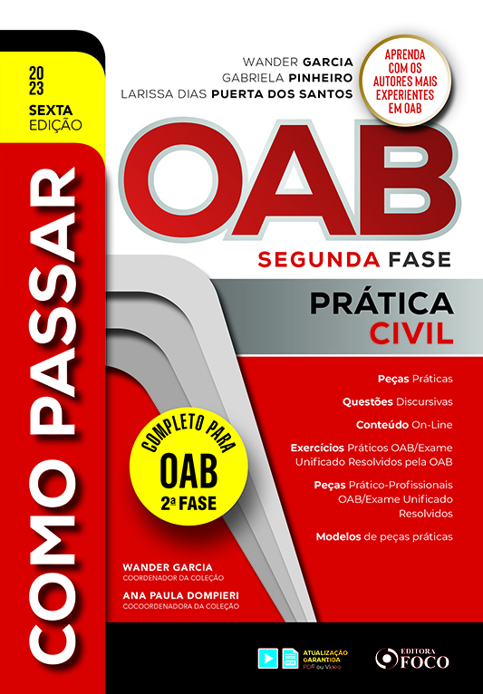 Sobre a obra Como Passar na OAB 2ª Fase - Prática Civil - 6ª Ed - 2023 Após anos dedicados ao estudo do direito, das leis, dos mais diversos modelos e resultados de interpretação, nos tornamos pouco a pouco mais conservadores, desenvolvemos um certo apego à ordem e à previsibilidade. A segurança jurídica que nos é apresentada como conceito vago no início da Graduação, ganha forma, contexto e valor para quem pretende o exercício da advocacia. Esse livro foi feito para você, bacharel em Direito que busca a aprovação no Exame de Ordem dos Advogados do Brasil. Com o objetivo de te auxiliar na construção do seu sonho idealizamos uma obra científica que fosse capaz de concentrar as mais recentes provas e questões apresentadas nos últimos exames realizados no Brasil. Você acaba de adquirir um exemplar totalmente renovado, revisado e com as mais preciosas dicas e sugestões idealizadas especialmente para a sua preparação para o exame que te concederá autorização para o exercício de uma fundamental carreira essencial à função jurisdicional. É sabido que o efetivo exercício da advocacia, pública ou particular, depende da aprovação no Exame de Ordem, que felizmente está consagrado em nosso cenário jurídico pois é inegavelmente reconhecido como ferramenta básica para o ingresso de profissionais de qualidade no mercado de trabalho. Foi justamente visando a melhor preparação dos nossos profissionais que essa obra foi idealizada. Fruto de parceria entre os professores Wander Garcia e Larissa Dias Puerta dos Santos, a obra se vale de conceitos técnicos e jurídicos para o auxílio do examinando em sua adequada preparação e consequente concretização de um sonho. Nosso objetivo primordial é o seu sucesso!