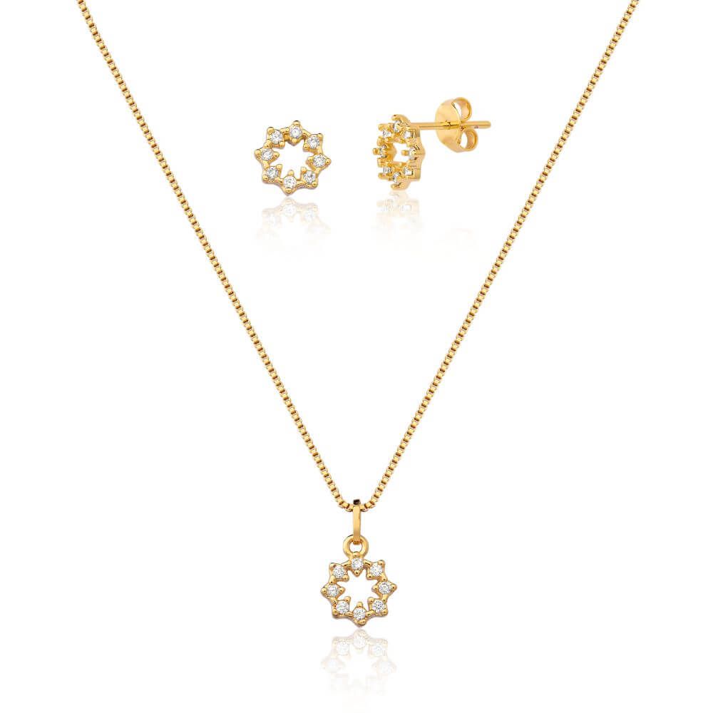 Conheça o encanto do gracioso Conjunto Colar e Brinco Estrela com Zircônias, uma semijoia que celebra o brilho das estrelas. Este conjunto de colar e brincos foi habilmente criado para mulheres que são apaixonadas por acessórios estelares e desejam adicionar um toque celestial ao seu estilo.<br /> <br /> O conjunto é composto por um colar e brincos encantadores, cada um apresentando estrelas delicadas cravejadas com zircônias cintilantes. O banho de ouro 18k realça o brilho das zircônias, conferindo às estrelas um toque de luxo e sofisticação. O verniz antialérgico garante conforto durante o uso, permitindo que você desfrute dessas joias com tranquilidade.<br /> <br /> As estrelas são símbolos de sonhos, esperança e inspiração, e este conjunto é uma representação visual do seu amor por esses elementos. Cada estrela brilhante é como um lembrete constante de que o céu é o limite quando se trata de estilo e expressão pessoal.<br /> <br /> O gracioso Conjunto Colar e Brinco Estrela com Zircônias, banhado em ouro 18k com verniz antialérgico, é mais do que uma simples combinação de brincos e colares; é um tributo à sua paixão pelas estrelas e pela beleza das semijoias.<br /> <br /> Ao usá-lo, você adiciona um toque de encanto celestial ao seu visual, refletindo sua admiração pelo cosmos e sua busca por estilo único. Com este conjunto, você não apenas exibe sua afinidade por acessórios estrelados, mas também carrega consigo um símbolo de sonhos e brilho que ilumina sua jornada diária com elegância e inspiração.<br /> <br /> <br /> <br /> Banho - ouro 18k<br /> <br /> Pedra - zirconias <br /> <br /> Tamanho - pingente: 0,8 cm diam. / brinco: 0,8 cm diam. <br /> <br /> Corrente - veneziana / 45 cm + 5 cm de extensor <br /> <br /> <br /> <br /> Cada detalhe, uma dedicação especial - Receba sua semijoia em um saquinho delicadamente perfumado<br /> <br /> Nós acreditamos que cada momento da sua jornada de compras conosco deve ser inesquecível, e é por isso que damos atenção especial aos detalhes.<br /> <br /> Você receberá sua semijoia envolvida em um saquinho reutilizável e exclusivo de nossa marca, delicadamente perfumado com uma essência encantadora, criada especialmente para tornar memorável a sua experiência conosco.<br /> <br /> <br /> <br /> Um Toque de Encanto ao Presentear - Surpreenda com nossa embalagem exclusiva<br /> <br /> Se você está presenteando alguém especial com nossas semijoias, saiba que nosso saquinho exclusivo será o toque final para um presente verdadeiramente encantador, mostrando que cada detalhe foi pensado com muito carinho.<br /> <br /> É uma forma de transmitir todo o afeto e cuidado que você dedica a quem receberá esse presente especial de nossa marca.<br /> <br /> Além disso, o saquinho é reutilizável, permitindo que a presenteada também desfrute de toda a beleza e charme dessa embalagem exclusiva.<br /> <br /> <br /> <br /> Aproveite essa experiência única conosco e encante-se com cada detalhe que preparamos para você. Seja para você ou para presentear, nossa embalagem perfumada tornará cada momento ainda mais especial.
