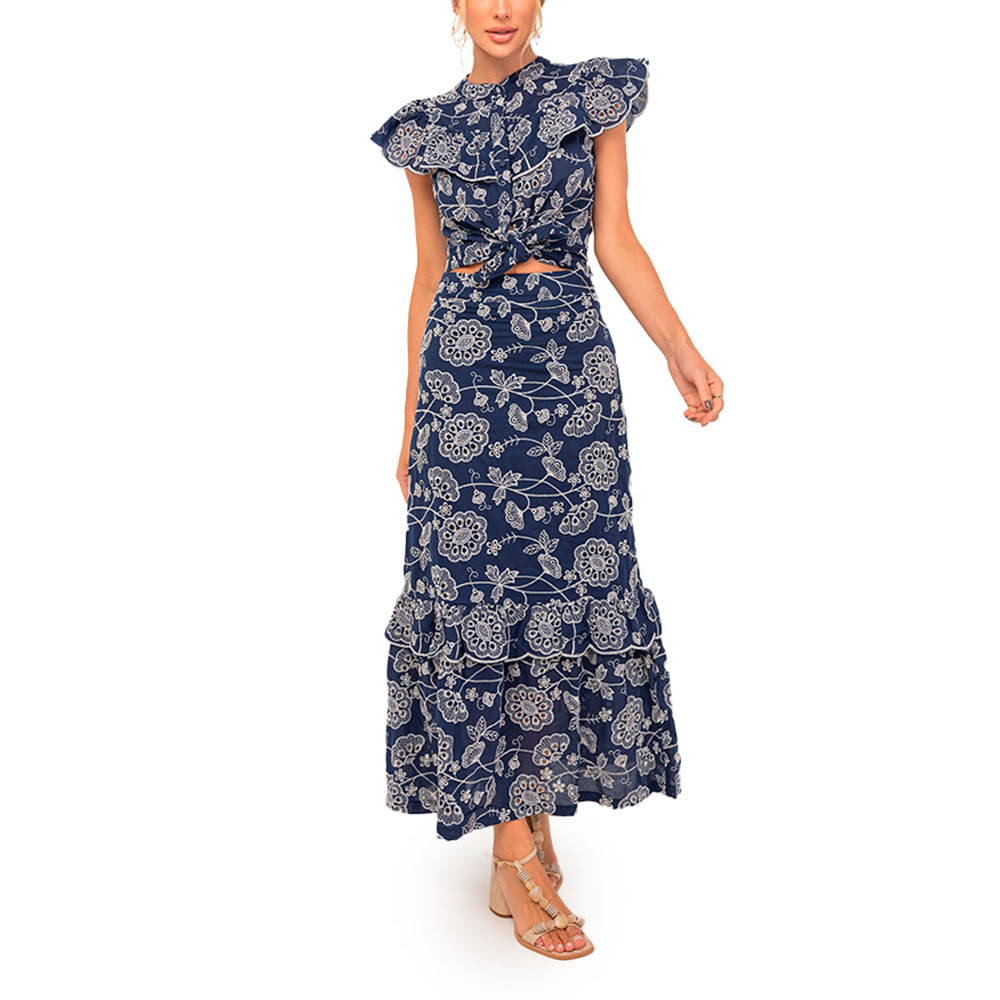 Conjunto feminino confeccionada em laise, um tecido com bordados florais e caimento leve; O bordado em flores traz feminilidade ao visual; A camisa conta com amarração frontal, babados aplicados e fechamento frontal por botões, e a saia conta com cós alto e barra com babados em camadas; <br><br>.<br><br><br>Produto : Conjunto Laise Babados Marinho <br>Categoria:Conjunto<br>Cor: Azul Marinho <br>Contém 01 Camisa + 01 Saia<br>Tecido: Laise Poa<br>Composição : 90% Poliester/10% algodão<br>Peso :300 g<br>Gênero: Feminino<br>Marca: Vértice<br>.<br><br><br>Medidas<br>P - Busto até 90 cm l Cintura até 71 cm l Quadril até 99 Cm.<br>M - Busto até 96 cm l Cintura até 77 cm l Quadril até 102 cm.<br>G - Busto até 102 cm l Cintura 83 cm l Quadril 111 cm.<br>GG - Busto 108 cm l Cintura até 89 cm l Quadril até 117 cm.<br>EGG - Busto até 114 cm l Cintura até 95 cm l Quadril até 123 cm.<br><br><br><br><br><br><br><br><br><br><br><br><br><br><br><br><br><br><br><br><br><br><br><br><br><br><br><br><br><br><br>