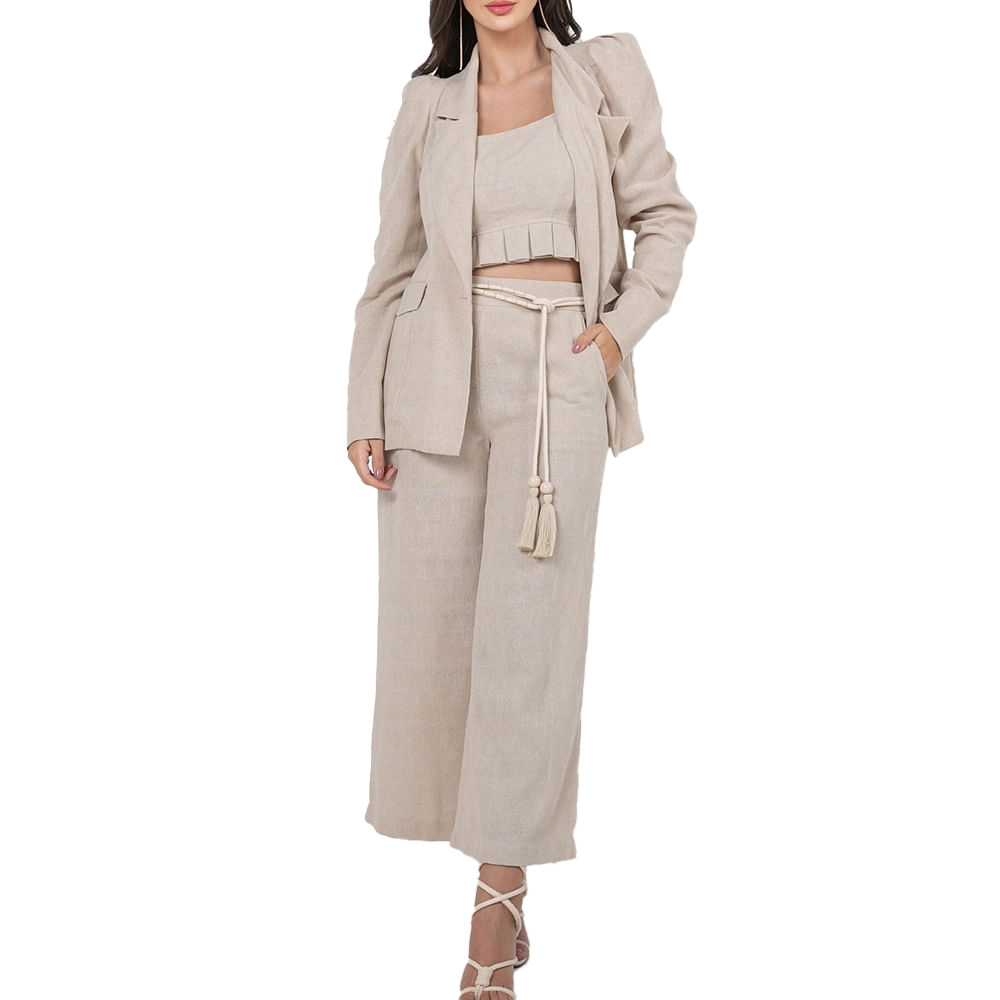 Conjunto feminino confeccionado em linho, um tecido natural com ótima respirabilidade; O conjunto em linho é a peça ideal para um visual fashion e que as antenadas em moda adoram, principalmente durante o dia; Invista!<br><br>. <br><br>Produto : Conjunto Linho Calça Nude<br>Categoria:Conjunto<br>Cor: Nude <br>Contém 01 Top + 01 Calça+ Blazer <br>Tecido: Linho <br>Composição : 11% viscose /43% poliester / 31% algodão/ 15% linho <br>Peso :300 g<br>Gênero: Feminino<br>Marca: Vértice<br>.<br><br><br><br>Medidas<br>P - Busto até 90 cm l Cintura até 71 cm l Quadril até 99 Cm.<br>M - Busto até 96 cm l Cintura até 77 cm l Quadril até 102 cm.<br>G - Busto até 102 cm l Cintura 83 cm l Quadril 111 cm.<br>GG - Busto 108 cm l Cintura até 89 cm l Quadril até 117 cm.<br>EGG - Busto até 114 cm l Cintura até 95 cm l Quadril até 123 cm.<br>