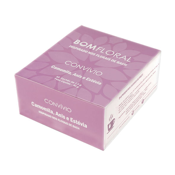 Informações sobre o produto:<br> O Blend Convívio, da BomFloral, inspirado nos Florais de Bach, é formulado com Camomila, um remédio natural para diversos problemas de saúde; estévia, e anis.<br> <br> Contém 60 sachês, desenvolvidos com ervas cuidadosamente selecionadas, é totalmente natural, livre de glúten, conservantes e aromatizantes artificiais.<br> <br> Recomendação de consumo:<br> Coloque 1 sachê de chá para cada xícara, pode ser preparado em água gelada ou água (não fervente) e deixe em infusão até o sabor e o aroma ficarem a seu gosto.<br> <br> Motivos para escolher esse produto?<br> Com ingredientes naturais<br> Sem conservantes artificiais<br> Sem corantes<br> Selo de qualidade Qualy Ervas<br> Sem aromas artificiais<br> Sem adição de açúcar<br> Não contém glúten<br> Isento de lactose<br> Adoçante natural<br> Informações sobre a marca<br> A BomFloral quer unir a delicadeza das plantas, das flores e de suas propriedades, em produtos que transformam o bem estar e dia a dia das pessoas em momentos únicos. Nossa jornada começa com uma linha de chás inspirados nos Florais de Bach – a BomFloral. São sete chás que estão alinhados com os grupos emocionais definidos pelo Dr. Bach.