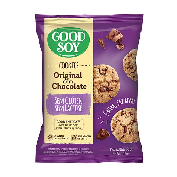 Cookies de soja, original com chocolate, da Good Soy são ótimos snacks feitos a partir da soja não transgênica, farinha de aveia integral sem glúten, chia e quinoa. São isentos de glúten e de lactose, podendo ser consumidos por pessoas com intolerâncias alimentares.
