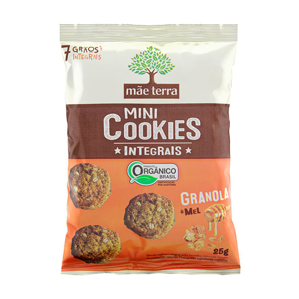 Informações técnicas do produto:<br> Cookies Orgânico Granola e Mel, Mãe Terra são mini biscoitos integrais, crocantes, saborosos e práticos que podem ser levados para todos os lugares. Feito com farinhas integrais, mel, granola, corantes naturais e sem adição de açúcares refinados, é fonte de fibras, selênio e zinco.<br> <br> Recomendação de consumo:<br> Pode ser consumida como lanches entre as refeições ou como preferir.<br> <br> Informações sobre alergênicos:<br> Contém derivados da aveia, da soja e do trigo. Pode conter cevada e seus derivados, leite e seus derivados, centeio e castanhas (Pará, caju, avelã, amêndoa e nozes).<br> <br> Por que escolher esse produto?:<br> Feito com ingredientes orgânicos<br> 7 grãos integrais<br> Leve e prático de comer<br> Fonte de fibras, selênio e zinco<br> Sem adição de açúcar refinado