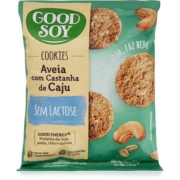 Cookies de Soja, Aveia com Castanha de Caju, da Good Soy é uma ótima opção de lanche saboroso e saudável, uma vez que é feito à base de soja não transgênica, além de aveia, chia e quinoa. Não contém lactose, podendo ser consumido por pessoas com intolerâncias.
