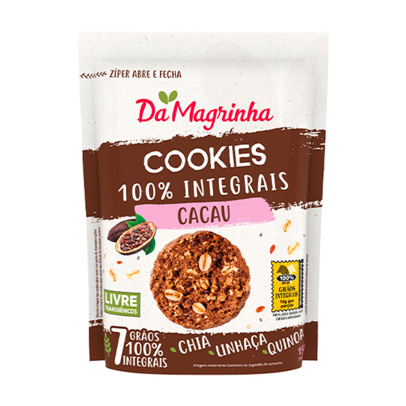 Informações técnicas sobre o produto:<br> Os cookies 7 grãos 100% integrais sabor cacau, Da Magrinha, possuem gotas de chocolate meio amargo, os deixando ainda mais gostosos!<br> <br> Seus ingredientes incluem a aveia em flocos, centeio, chia, linhaça dourada, quinoa e gergelim, que além do sabor delicioso e irresistível, são excelentes fontes de fibras e nutrientes para o seu dia! <br> <br> Sobre os ingredientes:<br> Conheça um pouco sobre alguns ingredientes dos cookies.<br> <br> Aveia: é um cereal com quantidades relevantes de fibras solúveis e insolúveis, e podemos destacar entre os minerais o zinco e manganês<br> Centeio: também é rico em muitos minerais, como manganês, cobre, magnésio, fósforo, e possui ainda vitaminas do complexo B<br> Quinoa: importante fonte de proteínas, e muito rica em magnésio, fósforo, folato e manganês.<br> Recomendações de consumo:<br> Uma ótima opção de lanche prático ao longo do dia. Pode, ainda, ser consumido antes ou depois da atividade física, conforme orientação do médico ou nutricionista.<br> <br> Por que escolher esse produto?<br> Rico em fibras<br> Rico em vitaminas e minerais, sendo muito nutritivo<br> Prático para levar com você em seu dia a dia<br> 100% integral<br> Sobre a marca:<br> A Da Magrinha é a 1ª marca do Brasil com tudo 100% integral. Tudo 100% assado, com Certificado Internacional Whole Grain, livre de transgênicos, 7 grãos nobres, embalagens em stand up pouch com zíper que abre e fecha, e com 40% de redução de plásticos. Produtos artesanais, saudáveis, gostosos e integral de verdade!