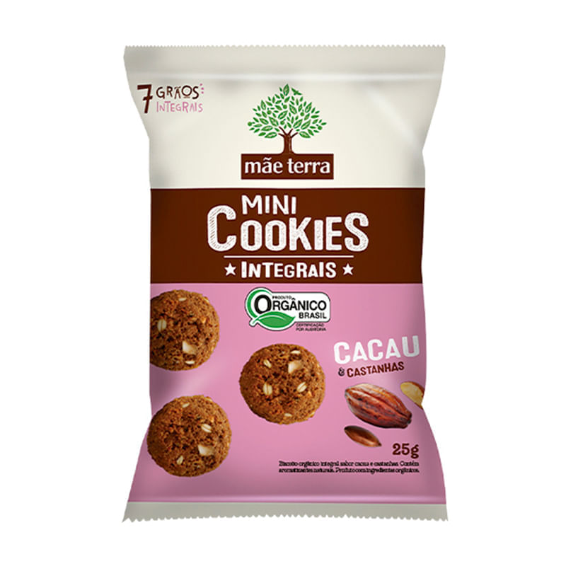 <p>Informações técnicas do produto:<br>Cookies Orgânico Cacau e Castanhas, Mãe Terra são mini biscoitos integrais e orgânicos, saborosos e práticos que podem ser levados para todos os lugares. Feito com farinhas e grãos integrais (aveia, chia, linhaça, quinoa, milho, arroz e trigo), castanhas, cacau em pó, corantes naturais e sem adição de açúcares refinados, é fonte de fibras e de selênio.<br><br>Recomendação de consumo:<br>Pode ser consumida como lanches entre as refeições ou como preferir.<br><br>Informações sobre alergênicos:<br>Contém glúten. Contém derivados da aveia, da soja e do trigo e castanhas (Pará, baru e nozes). Pode conter cevada e seus derivados, leite e seus derivados, amêndoa, castanha de caju, avelã e centeio.<br><br>Por que escolher esse produto?:<br>Feito com ingredientes orgânicos<br>7 grãos integrais<br>Leve e prático de comer<br>Fonte de fibras<br>Sem adição de açúcar refinado</p>