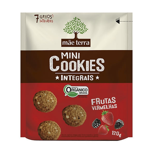 Informações técnicas do produto:<br> Cookies Orgânico Frutas Vermelhas, 120g, Mãe Terra são mini biscoitos integrais e orgânicos, práticos e saborosos. Feito com farinhas e grãos integrais, aromatizantes naturais, mix de frutas vermelhas, corantes naturais, não tem adição de açúcares refinados, é fonte de fibras, ferro e selênio e não contém gorduras trans.<br> <br> Recomendação de consumo:<br> Pode ser consumido nos lanches entre as refeições ou como preferir.<br> <br> Informações sobre alergênicos:<br> Contém glúten. Contém derivados da aveia, da soja e do trigo. Pode conter cevada e seus derivados, centeio e castanhas (Pará, caju, avelã, amêndoas e nozes).<br> <br> Por que escolher esse produto?:<br> Feito com ingredientes orgânicos<br> Leve e prático de comer<br> Fonte de fibras, ferro e selênio<br> Sem adição de açúcar refinado<br> Sem transgênicos<br> Feito com aromatizantes naturais<br> Sem lactose