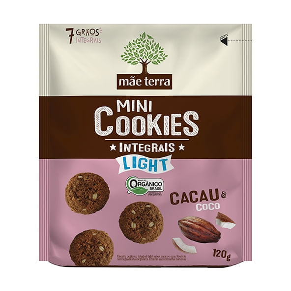 Informações técnicas do produto:<br>_x000D_ Cookies Orgânico Light Cacau e Coco, 120g, Mãe Terra são mini cookies integrais, práticos e saborosos. Feito com farinhas e grãos integrais, cacau em pó, corantes naturais, coco ralado e não tem adição de açúcares refinados, é fonte de fibras e selênio.<br>_x000D_ <br>_x000D_ Recomendação de consumo:<br>_x000D_ Pode ser consumida como lanches entre as refeições ou como preferir.<br>_x000D_ <br>_x000D_ Informações sobre alergênicos:<br>_x000D_ Contém glúten. Contém derivados da aveia, da soja e do trigo, pode conter castanhas (Pará, caju, avelã, amêndoas e nozes), cevada e seus derivados e centeio.<br>_x000D_ <br>_x000D_ Por que escolher esse produto?:<br>_x000D_ Feito com ingredientes orgânicos<br>_x000D_ Leve e prático de comer<br>_x000D_ Fonte de fibras e selênio<br>_x000D_ Sem adição de açúcar refinado<br>_x000D_ Sem transgênicos<br>_x000D_ Sem lactose
