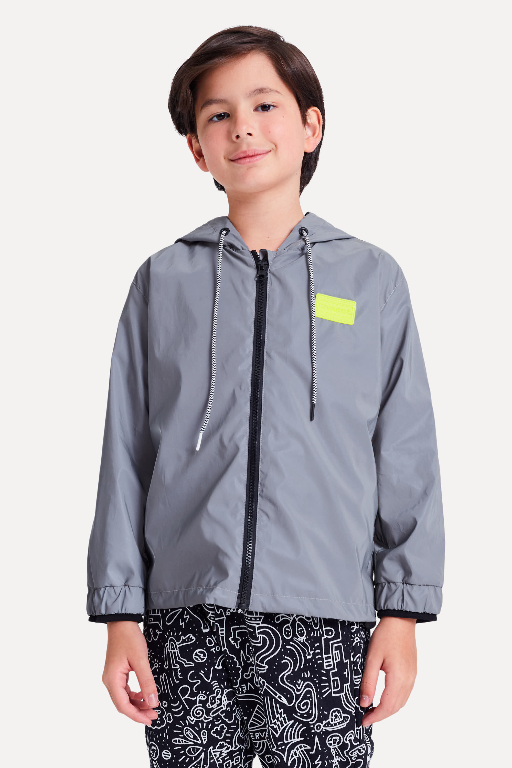 Casaco da linha infantil Reserva Mini. O corta vento em tecido refletivo tem capuz, ajuste com cadarço bicolor e ribana preta nos punhos. Ganhou cobre gola para maior conforto. Estiloso e confortável, pode ser usado fechado ou aberto com camisetas por baixo! Produzido eticamente no Brasil. Comprando esta peça, você complementa cinco pratos de comida através do nosso programa 1P=5P.