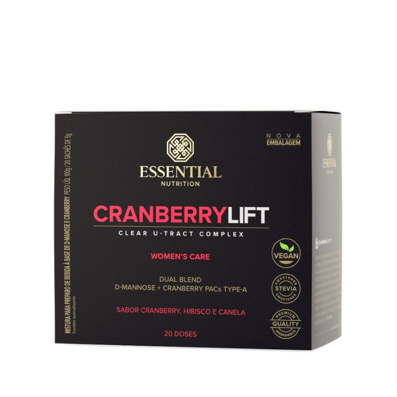<p dir="ltr">O <strong>Cranberry lift</strong> sabor cranberry, hibisco e canela<strong> Essential Nutrition</strong>, é um suplemento em pó a base de D-manose e cranberry. Possui alta concentração em proantocianidinas, um poderoso antioxidante presente na fruta. Com sabor e adoçantes naturais. </p> <h2 dir="ltr">Sugestão de consumo:</h2> <p dir="ltr">Consuma 5g (1 sachê) em aproximadamente 200ml (1 copo) de água gelada e misture até a total homogeneização. Beba imediatamente após o preparo ou conforme orientação de médico ou nutricionista.</p> <h2 dir="ltr">Motivos para escolher o produto:</h2> <ul> <li dir="ltr"> <p dir="ltr">Cranberry padronizado, contém 6x mais concentrado que a fruta in natura</p> </li> <li dir="ltr"> <p dir="ltr">Fonte de Proantocianidinas, poderoso antioxidante; </p> </li> <li dir="ltr"> <p dir="ltr">Combinação de proteína isolada da ervilha e das amêndoas; </p> </li> <li dir="ltr"> <p dir="ltr">Sem glúten e açúcar;</p> </li> <li dir="ltr"> <p dir="ltr">Sem corantes, aromatizantes e conservantes artificiais; </p> </li> <li dir="ltr"> <p dir="ltr">Vegano;</p> </li> <li dir="ltr"> <p dir="ltr">Zero sódio. </p> </li> </ul> <h2 dir="ltr">Sobre a marca:</h2> <p dir="ltr">A Essential Nutrition é uma marca especializada em nutrição funcional, produzindo produtos de extrema qualidade, utilizando as melhores matérias-primas e em suas concentrações ideias, excluindo o uso de ingredientes geneticamente modificados, glúten, lactose, corantes, conservantes e adoçantes artificiais.</p>