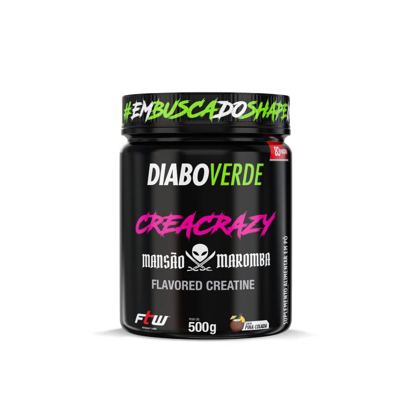 <p><strong>CREACRAZY MANSÃO MAROMBA PINA COLADA DIABO VERDE 500G</strong></p> <p>O <strong>Creacrazy Mansão Maromba Diabo Verde</strong> é a creatina monohidratada da FTW com o selo da Mansão Maromba e um sabor exclusivo de <strong>Pina Colada</strong>. Ideal para quem busca força, volume e desempenho físico. Fórmula pura, sem adição de açúcares, e um sabor que surpreende.</p> <p><strong>Sugestão de consumo: </strong></p> <p>Recomenda-se a ingestão de 3 g ao dia ou conforme recomendação do nutricionista ou médico.</p> <p><strong>Motivos para escolher o produto: </strong></p> <p style="padding-left: 40px;">100% creatina monohidratada;<br>Alto rendimento;<br>Com sabor;<br>Sem adição de açúcar;<br>Livre de glúten.</p> <p><strong>A marca:</strong></p> <p>A <strong>FTW </strong>nasceu do espírito <em>For The Win</em>, com a missão de oferecer suplementos de alta qualidade para quem leva o esporte a sério. Mais do que atender às demandas do desempenho físico, a marca inspira atletas de todos os níveis a superarem seus próprios limites, com produtos desenvolvidos para potencializar resultados. Com uma linha completa e rigorosamente testada, a FTW está presente na rotina de quem busca evolução constante. Cada fórmula carrega o compromisso com a performance, a saúde e a superação.</p>