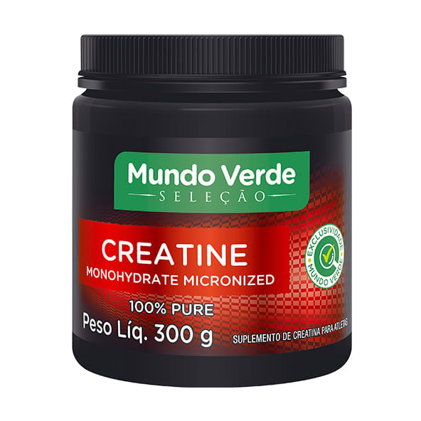 Informações técnicas do produto:<br> A Creatine da Mundo Verde Seleção, 300g, é um suplemento constituído exclusivamente de creatina monohidratada. Possui 3,0g de creatina na porção. Não contém glúten e não possui calorias, além de ser de fácil consumo e prático para levar em qualquer lugar.<br> Recomendação de consumo:<br> Tomar 1 porção (3,0g) ao dia, diluída em 200ml de bebida da sua preferência ou conforme orientação de Nutricionista ou Médico.<br> *1 dosador equivale a aproximadamente 3,0g.<br> Motivos para escolher esse produto?<br> Contém creatina monohidratada<br> 3,0g de creatina porção<br> Fácil preparo<br> Sem glúten<br> Isento de calorias<br> Sobre a marca:<br> A Mundo Verde Seleção é uma linha de produtos para quem quer ter uma vida mais saudável e gostosa. A marca quer ajudar a colocar essas escolhas em prática. A paixão e conhecimento pelos alimentos, nutrientes, aromas e sabores permitem a seleção das melhores opções saudáveis para qualquer ocasião. Conheça a linha completa Mundo Verde Seleção, com inúmeros produtos saudáveis e gostosos para facilitar seu dia a dia.