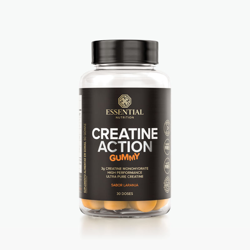 <p dir="ltr">A <strong>Creatine Action Gummy sabor laranja Essential Nutrition</strong> é um suplemento alimentar formulado com creatina monoidratada altamente purificada em formato de goma. Oferece 3 g de creatina por porção diária e é livre de açúcares, corantes e conservantes artificiais, com adoçamento e coloração natural. Ideal para quem busca conveniência sem abrir mão da qualidade.</p> <h2 dir="ltr">Sugestão de consumo:</h2> <p dir="ltr">Recomenda-se o consumo de 2 gomas ao dia ou conforme recomendação de profissional da saúde.</p> <h2 dir="ltr">Motivos para escolher o produto:</h2> <ul> <li dir="ltr" aria-level="1"> <p dir="ltr" role="presentation">3 g de creatina monoidratada em 2 gomas;</p> </li> <li dir="ltr" aria-level="1"> <p dir="ltr" role="presentation">Fácil absorção;</p> </li> <li dir="ltr" aria-level="1"> <p dir="ltr" role="presentation">Sabor natural;</p> </li> <li dir="ltr" aria-level="1"> <p dir="ltr" role="presentation">Zero açúcar;</p> </li> <li dir="ltr" aria-level="1"> <p dir="ltr" role="presentation">Sem glúten, lactose, corantes ou conservantes artificiais;</p> </li> <li dir="ltr" aria-level="1"> <p dir="ltr" role="presentation">Prática para consumo.</p> </li> </ul> <h2 dir="ltr">A Marca</h2> <p dir="ltr">A Essential Nutrition é uma marca especializada em nutrição funcional, produzindo produtos de extrema qualidade, utilizando as melhores matérias-primas e em suas concentrações ideias, excluindo o uso de ingredientes geneticamente modificados, glúten, lactose, corantes, conservantes e adoçantes artificiais.</p>