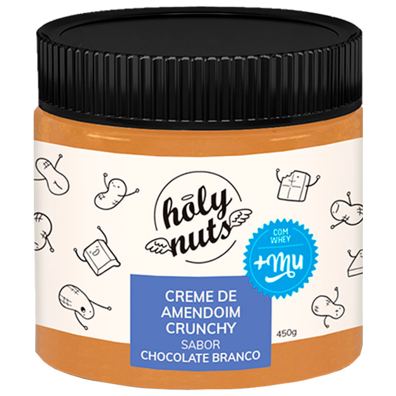 <p>O <strong>Creme de amendoim chocolate branco Holy Nuts 450g</strong>, possui uma nova fórmula, muito mais cremosa, gostosa e sem adição de açúcar!</p> <p>Além de contar com a proteína natural do amendoim, a Pasta Crunchy também leva um ingrediente super especial: nosso Whey +Mu. Ela tem sabor de Chocolate Branco e é adoçado naturalmente com Stevia. Ahhh! Ele também leva pedacinhos crocantes de amendoim pra ficar ainda mais gostoso! Fala sério, deu até água na boca só de falar!</p> <p>Lembrando que, como a nossa Pasta de Amendoim Crunchy é proteica, ela está prontíssima pra matar a sua fome durante a tarde e evitar que você meta o pé na jaca na próxima refeição!</p> Sobre os ingredientes: <p>Amendoim torrado; Óleo de algodão; Concentrado protéico de soro de leite em pó (whey protein concentrado); Soro de leite em pó; Leite em pó integral Edulcorantes Maltitol e Stevia; Aromatizante idêntico ao natural; Emulsificante lecitina de girassol. Não contém Glúten. Contém lactose.</p> Alergênicos:<p> Contém amendoim, leite e derivados, pode conter avelã, castanha de caju e amêndoa.</p> Sugestão de consumo: <p>A gente recomenda durante o lanchinho, pra matar aquela fominha da tarde e não sair por aí comendo tudo o que vê pela frente na hora da janta!</p> Motivos para escolher o produto: <ul> <li> <p>Não tem adição de açúcares</p> </li> <li> <p>Adoçado naturalmente apenas com Stevia</p> </li> <li> <p>Sem glúten</p> </li> <li> <p>Possui mais de 30% de proteína</p> </li> <li> <p>Leva Whey Concentrado +Mu</p> </li> <li> <p>Pote livre de BPA</p> </li> </ul> Sobre a marca: <p>A <strong>+Mu</strong> é uma empresa que atua no mercado de suplementos desde 2014, nasceu com o objetivo de democratizar as proteínas do soro do leite fazendo a melhor proteína possível. A marca recebe o selo “Eu Reciclo”, o que torna seus produtos sustentavelmente proteicos, compensando o impacto ambiental com a colaboração para a cadeia de reciclagem.</p>