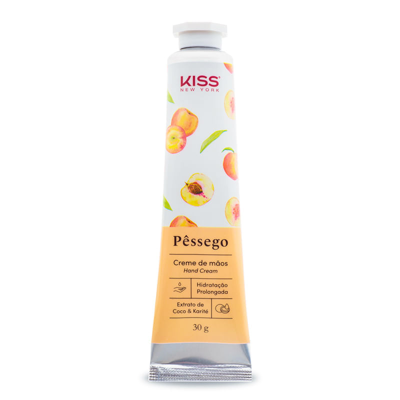 <p>Cuidar das mãos agora faz parte da sua rotina, então por que não aproveitar para fazer desse hábito um ritual prazeroso? Para isso existe o<strong> Creme de Mãos Pêssego Kiss New York 30g.</strong> A Kiss New York conta com uma linha completa de Creme de Mãos e Álcool em Gel Antisséptico, produtos que formam um combo perfeito para os cuidados com a sua saúde e o seu bem-estar.</p> <p>Enquanto o álcool em gel 70% é responsável por higienizar e proteger, o creme de mãos traz a dose certa de hidratação para evitar que a região fique ressecada com a constante limpeza das mãos (seja com álcool em gel ou com água e sabão). Ao todo, são 5 fragrâncias que perfumam as mãos delicadamente.</p> <p>O Kiss New York Creme de Mãos Pêssego conta com vitamina e extrato vegetal, tem textura cremosa e alto poder de hidratação porque é rico em extrato de coco e karité, ingredientes que também tornam seu toque suave e aveludado. O melhor? Tudo isso com uma rápida absorção e com uma fórmula não irritante ou oclusiva.</p> <p>Com formato pocket, o creme de mãos da Kiss New York tem o tamanho perfeito para você carregar na bolsa e usar sempre após a higienização com álcool. Aposte nessa combinação e garanta mãos protegidas, hidratadas e perfumadas! Vamos juntos espalhar cuidado?</p> Sugestão de uso: <p>Você sabia que existe um jeito certo de aplicar creme de mãos? Ao contrário do que muitas pessoas estão habituadas, o produto não deve ser aplicado nas palmas das mãos, mas sim na parte externa, que é mais suscetível ao ressecamento. Por isso, depois que o álcool em gel já estiver seco, aplique o creme no dorso das mãos, espalhando em toda a região, no punho e, por fim, também nas palmas da mão.</p> Motivos para escolher o produto: <ul> <li> <p>Textura cremosa e alto poder de hidratação</p> </li> <li> <p>Rico em óleo de coco e karité</p> </li> <li> <p>5 fragrâncias aconchegantes que perfumam as mão delicadamente</p> </li> <li> <p>Toque suave e aveludado</p> </li> <li> <p>Fórmula flexível que reduz a chances das unhas decolarem com facilidade</p> </li> </ul> Sobre a marca: <p> <strong>Kiss New York</strong>, desde 1988, oferece produtos de qualidade diretamente ao consumidor final por meio de itens fáceis de usar e que promovem resultados de salão. De início, seu foco era desenvolver fórmulas para uma manicure profissional em casa. Porém, seu portfólio cresceu expressivamente, ao ponto de se tornar referência mundial em maquiagem.</p>