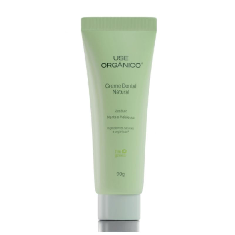 <p>O <strong>Creme Dental Natural Menta e Melaleuca</strong>, da <strong>Use Orgânico</strong>, 90g, é um produto que cuida da saúde bucal, sem agredir a gengiva e o esmalte dos dentes. Fórmula desenvolvida com óleo essencial de tea tree orgânico, que age contra bactérias e germes, além de ser antisséptico, cicatrizante e anti-inflamatório. O Creme Dental Vegano sem flúor também é rico em óleos essenciais de eucalipto e hortelã que traz frescor, limpeza e hálito fresco para o seu dia a dia.</p> <h2>Recomendação de uso:</h2> <p>Escove seus dentes pelo menos 3 vezes ao dia, após as refeições e antes de dormir ou conforme recomendação do seu dentista. Molhe as cerdas da escova, aplique 2 cm do Creme Dental Natural Sem Flúor de Menta e Melaleuca da Use Orgânico e escove por, no mínimo, 1 minuto. Enxágue normalmente.</p> <h2>Motivos para escolher o produto:</h2> <ul> <li> <p>Produto 100% Natural e Vegano</p> </li> <li> <p>Não agride a gengiva e o esmalte dos dentes</p> </li> <li> <p>Embalagem de fonte renovável originária de cana de açúcar I'm Green</p> </li> <li> <p>Sem Flúor</p> </li> <li> <p>Com Hidrolato de Tea Tree</p> </li> <li> <p>Livre de flúor, açúcar, triclosan e parabenos</p> </li> <li> <p> Não contém matérias-primas derivadas de óleos minerais</p> </li> <li> <p>Não testado em animais</p> </li> </ul> <h2>Sobre a marca:</h2> <p>A Use Orgânico foi criada para oferecer produtos de <strong>alto desempenho, eficientes e seguros, para isso o </strong>cuidado se dá na seleção dos produtos, na verificação dos certificados e selos dos fabricantes, na gestão sustentável da empresa e no compartilhamento de conhecimento.</p> <p>Escolher produtos naturais e orgânicos proporciona um jeito de viver alinhado à natureza e à essência do ser humano, e a Use Orgânico nasceu para ser o caminho confiável entre esses produtos e você.</p> <p> </p>