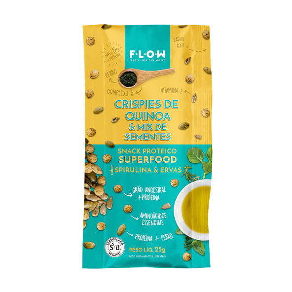Informações técnicas do produto:<br> O Snack crispies quinoa e mix de sementes sabor spirulina e ervas, da Flow Foods, 25 g, é um petisco orgânico proteico, que fornece 5,4 g de proteínas.<br> <br> Snack vegano, crocante e sem glúten, feito a partir de uma combinação de sementes com crispies de quinoa, um grão ancestral que possui muitos nutrientes, temperado com ingredientes naturais.<br> <br> Recomendação de consumo:<br> Snack pronto para o consumo que pode ser consumido em qualquer lugar e a qualquer momento do dia. Uma dica é consumi-lo na salada.<br> <br> Por que escolher esse produto?<br> 145 kcal por pacote<br> 5,4 g de proteínas<br> Não contém glúten<br> Baixo teor de carboidratos<br> Certificado vegano<br> Combinação de grão ancestral e proteína<br> Possui aminoácidos essenciais<br> Certificado orgânico<br> Sobre a marca:<br> A Flow Foods propõe aos seus clientes um estilo de vida saudável e um consumo consciente dos alimentos, com o intuito de incentivar o questionamento sobre o impacto da produção dos seus ingredientes no planeta. Não utilizam produtos de origem animal, o que permite que a marca tenha certificado e selo vegano pela Sociedade Vegetariana Brasileira.