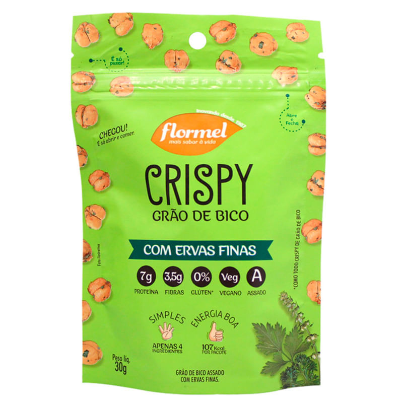 Informações técnicas do produto:<br> Crispy Grão de Bico com Ervas Finas, Flormel são petiscos crocantes feitos com apenas 4 ingredientes, sem corantes, conservantes e com ervas finas, que deixa o grão-de-bico ainda mais saboroso. Cada unidade de Crispy contém cerca de 3,5g de fibras e 7,0g de proteína. Pode ser consumido por pessoas com intolerâncias e alergias alimentares, além de ser vegano e vegetariano. <br> <br> Recomendação de consumo:<br> Pode ser consumido nos lanches intermediários, ou como desejar.<br> <br> Por que escolher esse produto?:<br> Sem glúten<br> Com fibras<br> Sem conservantes<br> Sem lactose<br> Zero corantes artificiais<br> 7,0g de proteínas por porção<br> Com Sal do Himalaia