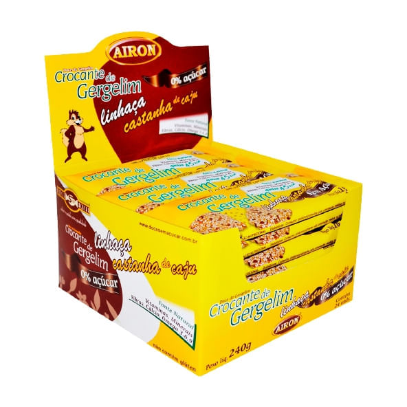 Informações técnicas do produto:<br> O Crocante de gergelim, linhaça e castanha de cajú, da Airon, é um snack sem adição de açúcar, isento de lactose e sem glúten. Uma opção nutritiva, fonte de fibras, com a praticidade das embalagens individuais para consumir a qualquer hora do dia.<br> <br> Recomendações de uso:<br> O Crocante de Gergelim, Linhaça e Castanha de Caju pode ser consumido nos lanches entre as principais refeições (café da manhã, almoço e jantar).<br> <br> Porque escolher este produto:<br> Sem corantes<br> Sem conservantes<br> Kosher<br> Isento de lactose<br> Sem glúten<br> Sem adição de açúcar<br> Livre de transgênicos<br> Prático<br> Fonte de fibras alimentares<br> Sobre a marca:<br> A Airon nasceu devido a uma condição médica da família Ferro: a restrição de açúcar. Assim, o criador da marca traçou como objetivo criar doces saudáveis, populares, de qualidade e que fossem deliciosos iguais aos da sua infância. Em 2000 começou a criação de produtos populares na indústria para indivíduos com restrições e não parou mais. A linha conta com produtos zero açúcar, sem lactose e sem glúten e relaciona ingredientes saudáveis, qualidade, sabor e nutrição no mesmo produto.